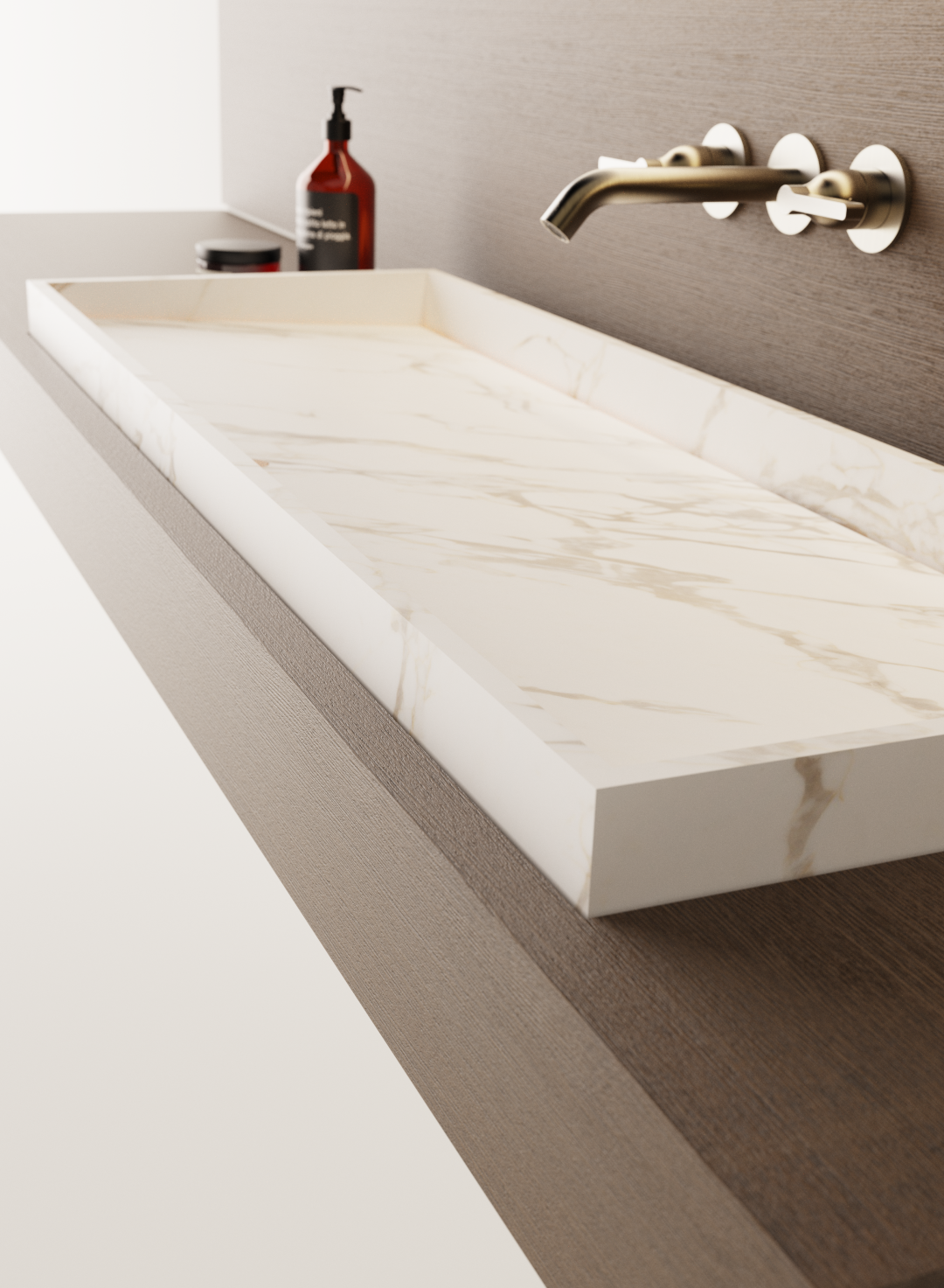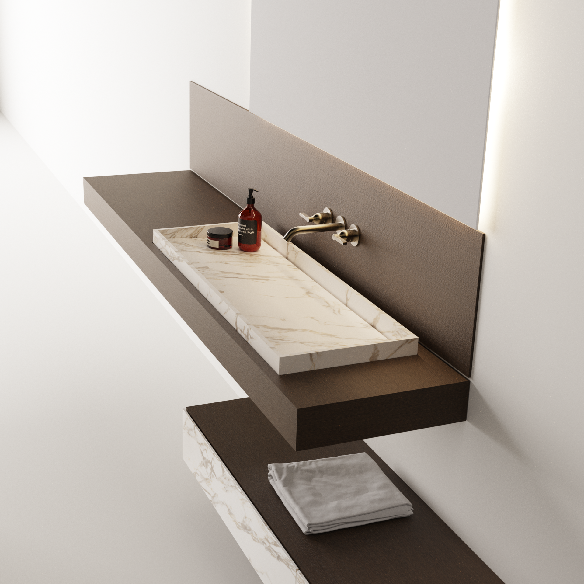 What happens when you interpret a design using a different material? How much does it affect the permanence of the form and the character of the object? This has been a research that Agape has been conducting for some time and it continues with the 004 washbasin. The semi-recessed basin, available in sizes from 60 to 120 cm, takes the essential design of the original version in glass and declines it in marble. Constructed with 15 mm slabs and with sloping shelf concealing the drain, thanks to the use of marble the linearity of the washbasin becomes visually striking and acquires a new, evocative physicality.
