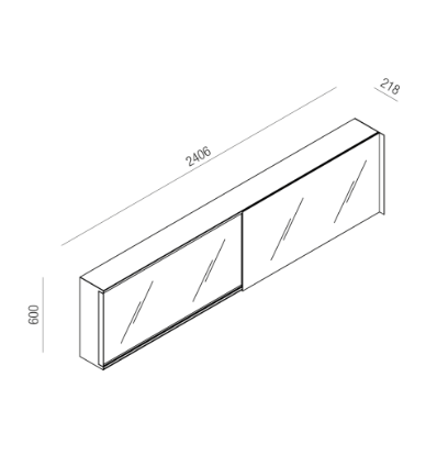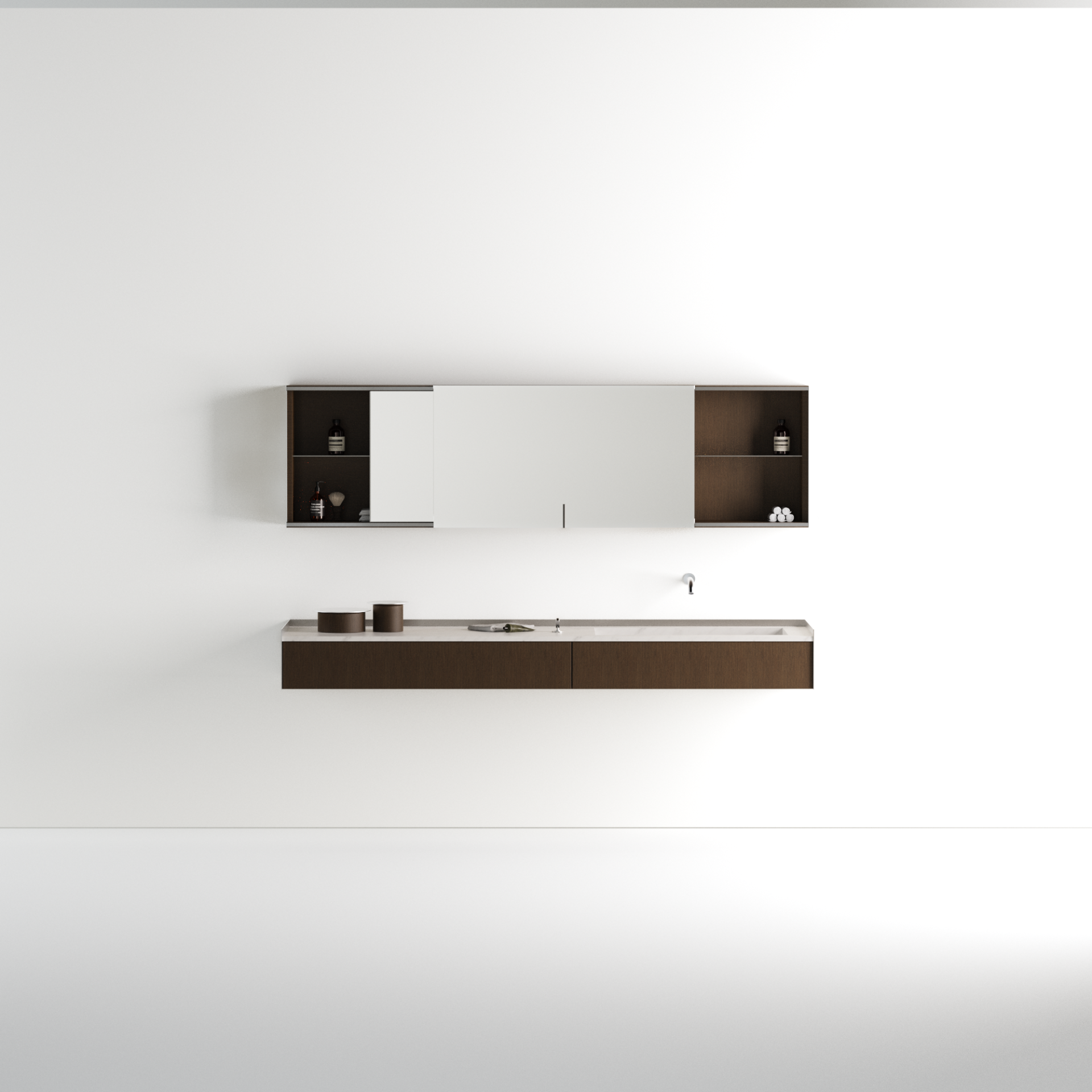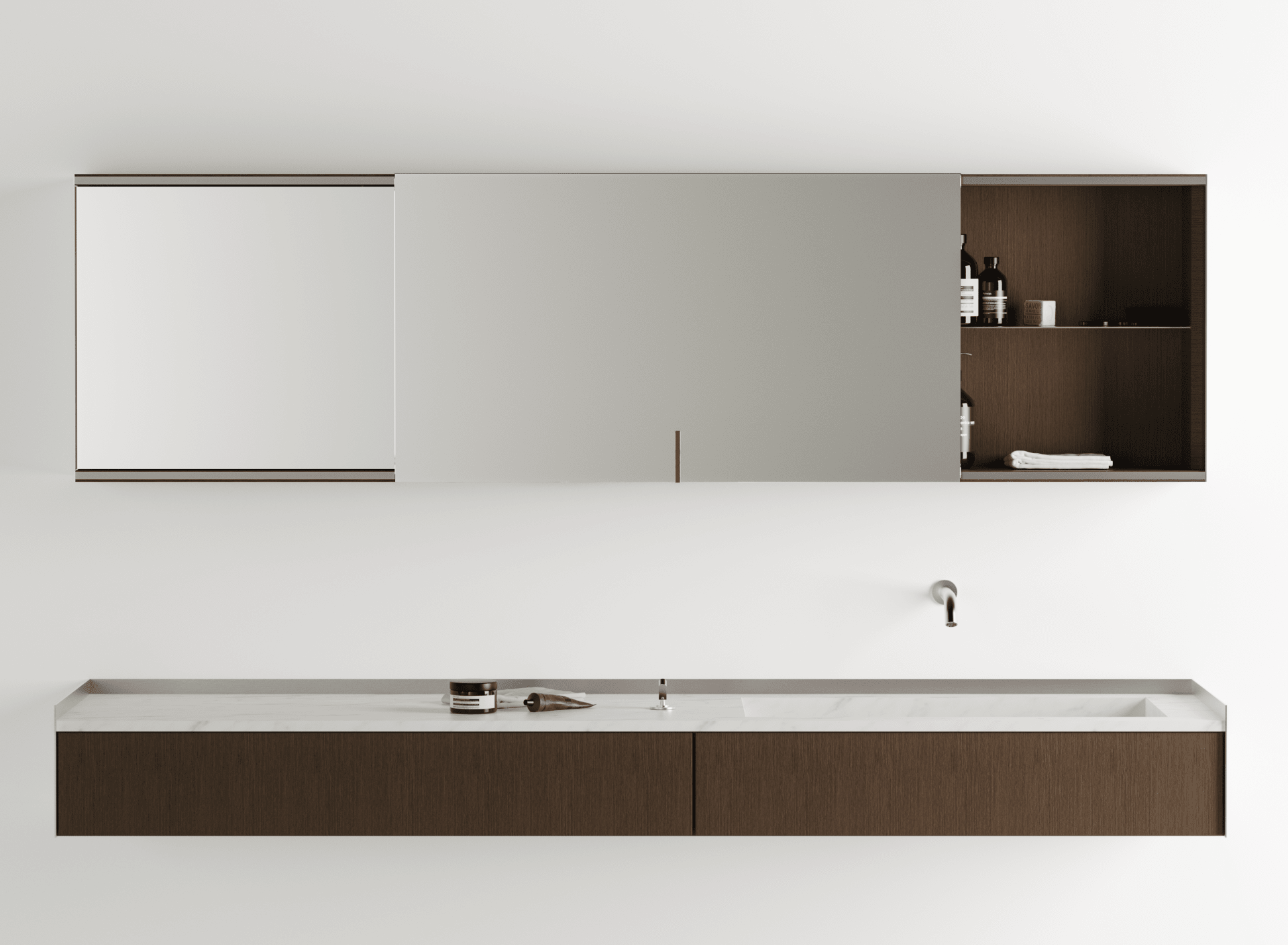 A natural evolution of the container mirror 027, model 028 takes up its extreme formal purity, maintaining the internal partitions in brushed stainless steel plates that define its character. The new version is enriched with an additional functionality: sliding mirrored doors allow to completely close the container, so that personal objects and accessories can be made invisible behind the elegant compactness of the reflective surfaces. 028 is available in lengths from 120 to 240 cm with a height of 60 cm.