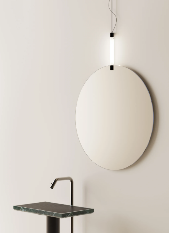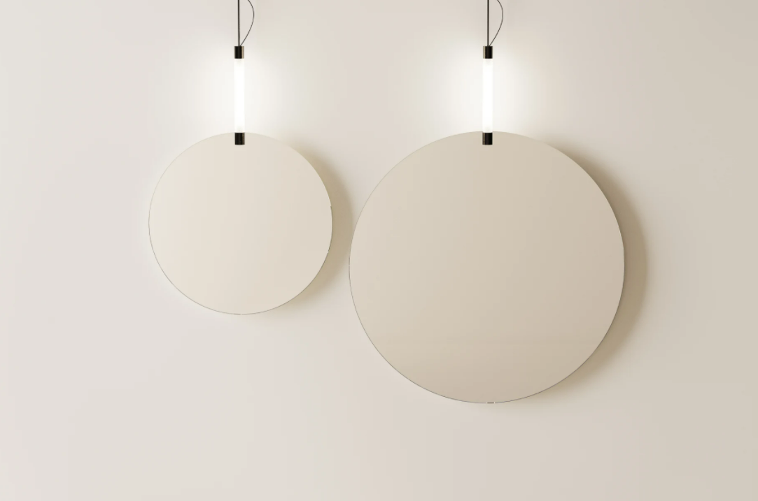 Benedini AssociatiPure geometry and intense decorative effects. A circle and a line. Faro is a series of wall-mounted mirrors, where the attachment element also serves as lighting. The mirrors are available in two diameters: 60 and 90 cm.