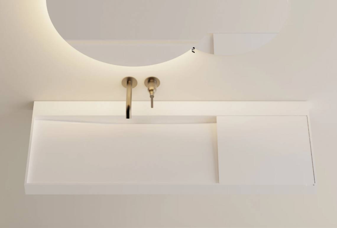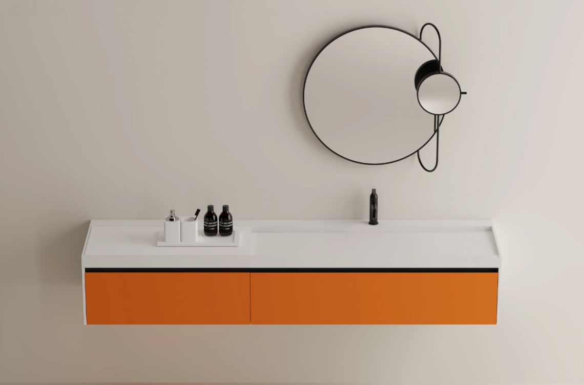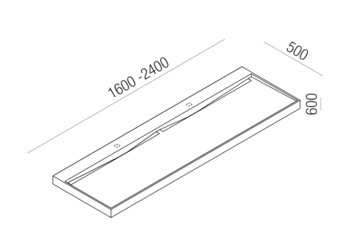 Litorale is a washbasin countertop with an uninterrupted linear basin available in lengths ranging from 80 to 240 cm. Only 6 cm thick, Litorale is manufactured in solid surface and it can be equipped with a number of trays available in three different sizes (20, 40 and 60 cm) made either in iroko or in the same material as the basin itself. For lengths above 160 cm, Litorale can be equipped with two faucets. In this case, to ensure proper flow management, the basin has to be equipped with the same number of wastes. The washbasin allows the installation of both over-countertop and wall mounted taps.