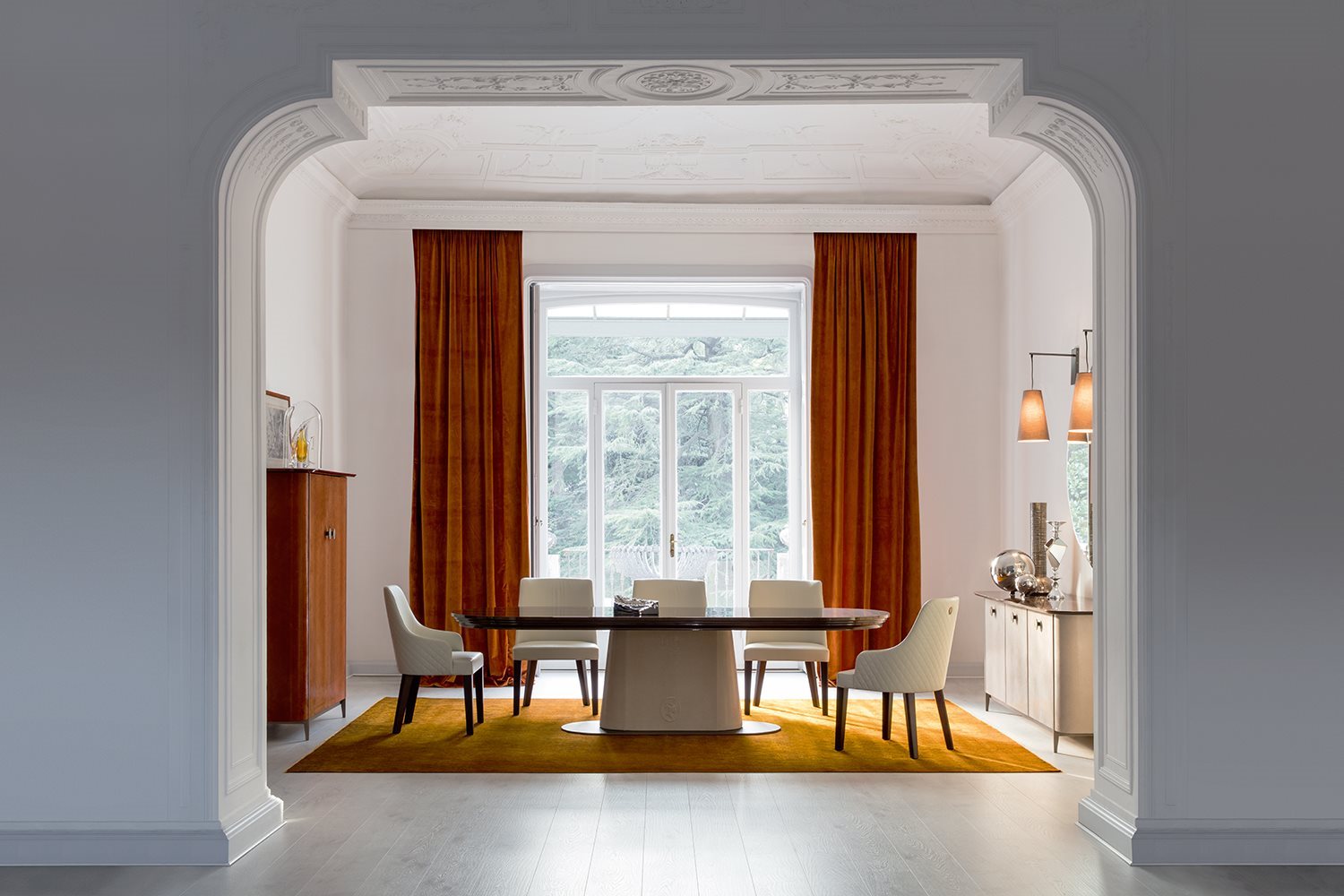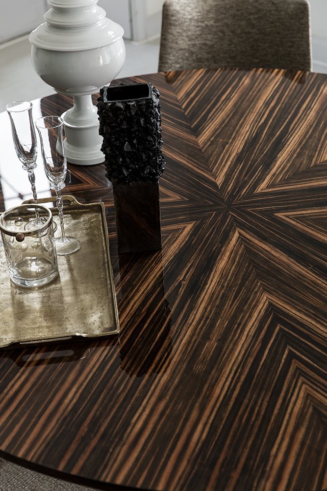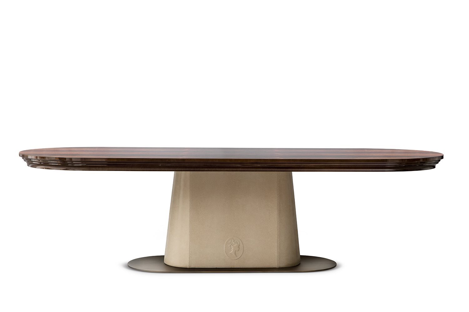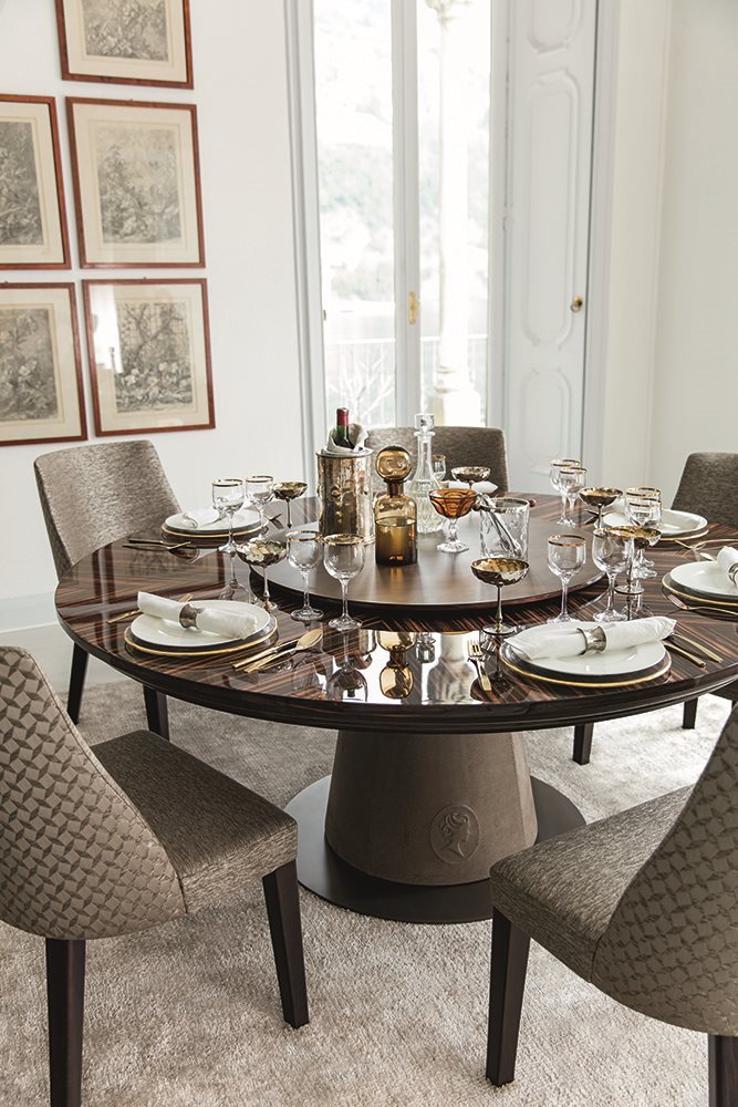 Judy’s architectural lines, combined with a refined selection of finishes, make it an exclusive table, suitable to be used in any classic or modern house. The elegant relief cameo positioned on the central support further enhances the stylish appearance of this design product.