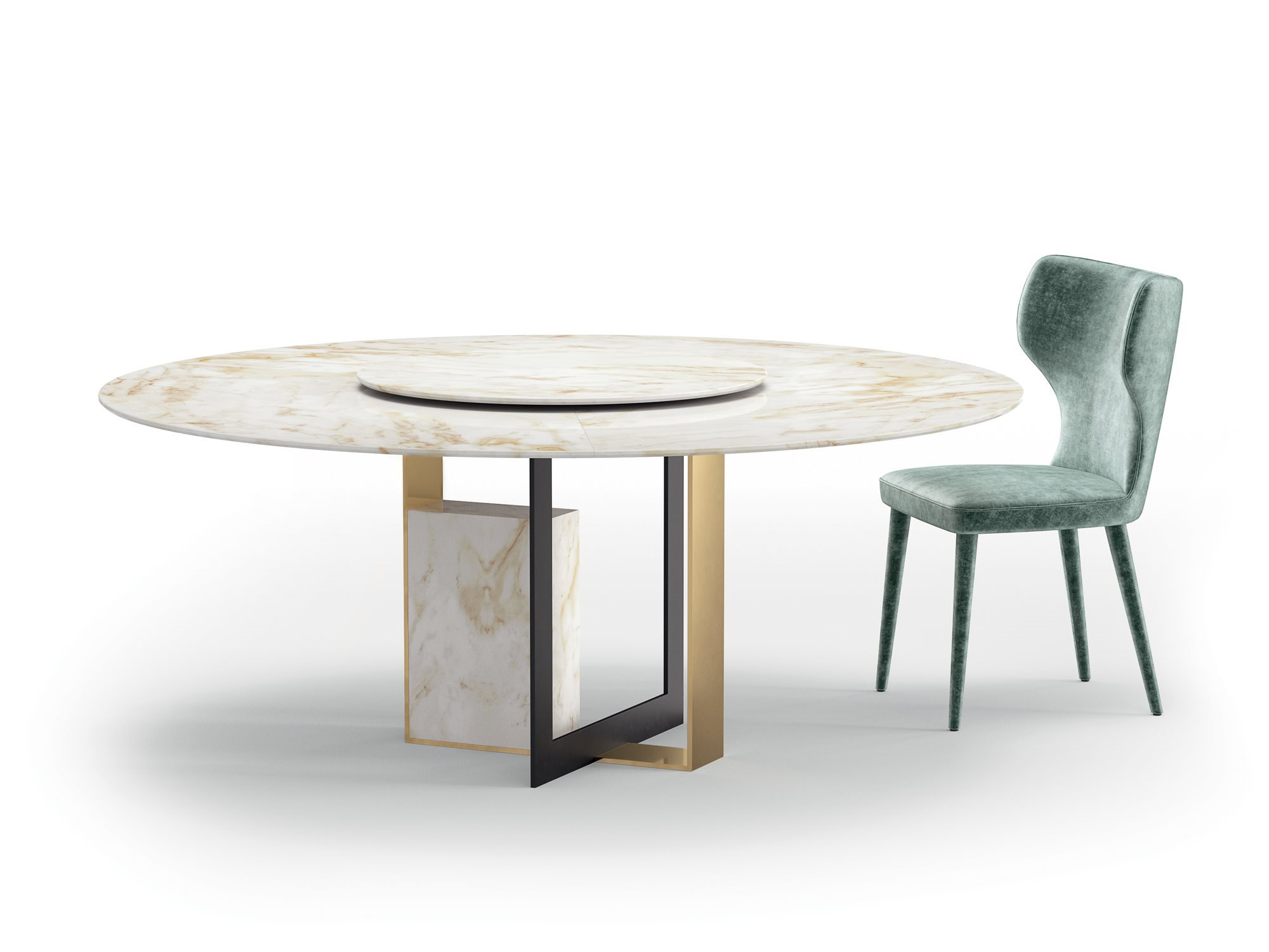 The Moore table is characterized by the research for a pure geometry through unusual volumes, lines, and cuts. The base is designed with careful balance, given by the interlocking between two metal plates: a glossy golden one that houses the monolithic block in ceramic with marble effect, and a matte black embossed one. Available in round or rectangular version, the top is made of ceramic with marble finish, to obtain thin yet resistant thickness.
