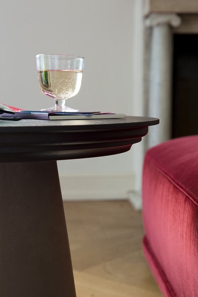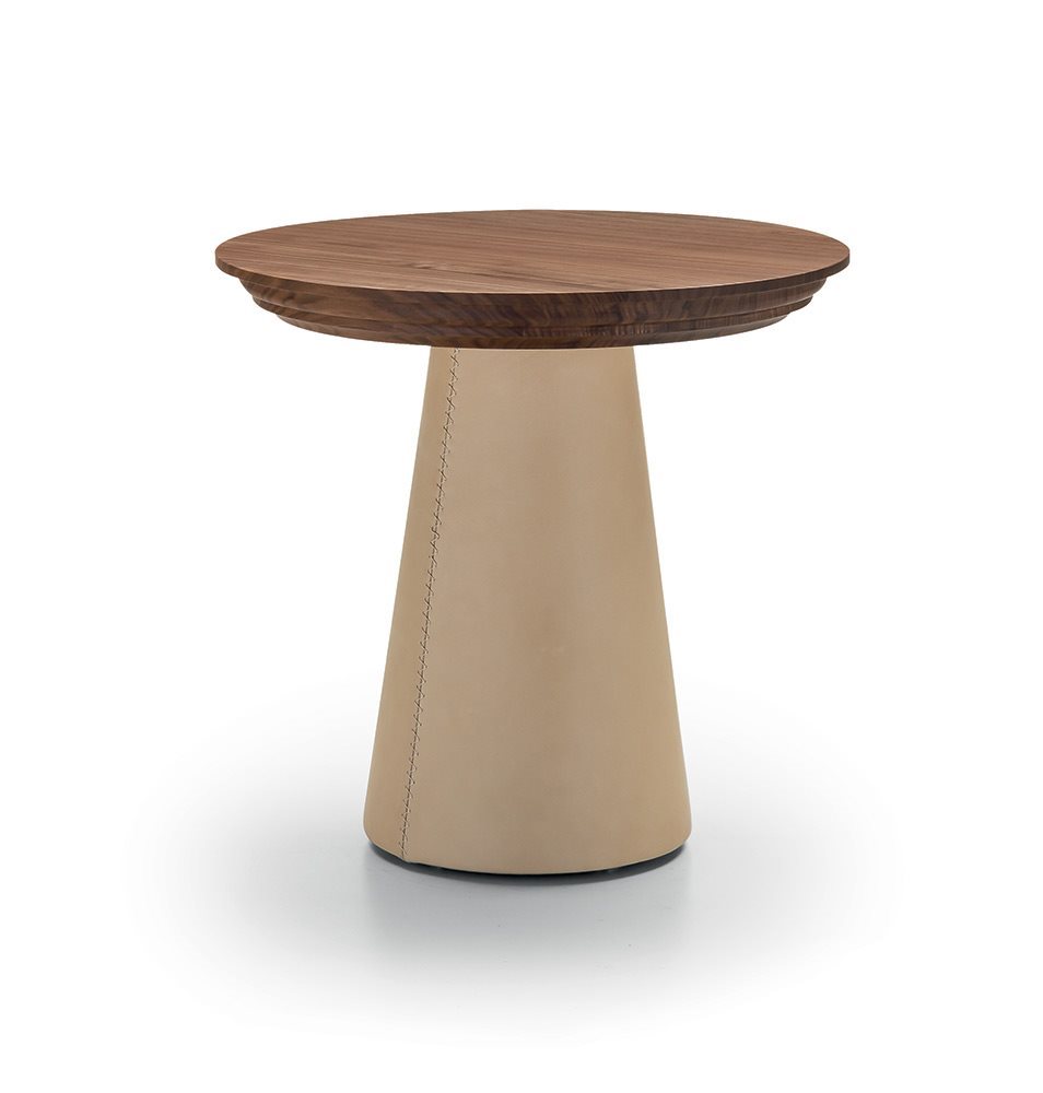 Small tables of two sizes with wood base covered in leather. Top in solid wood-finishing options: WALNUT, DARK OAK.