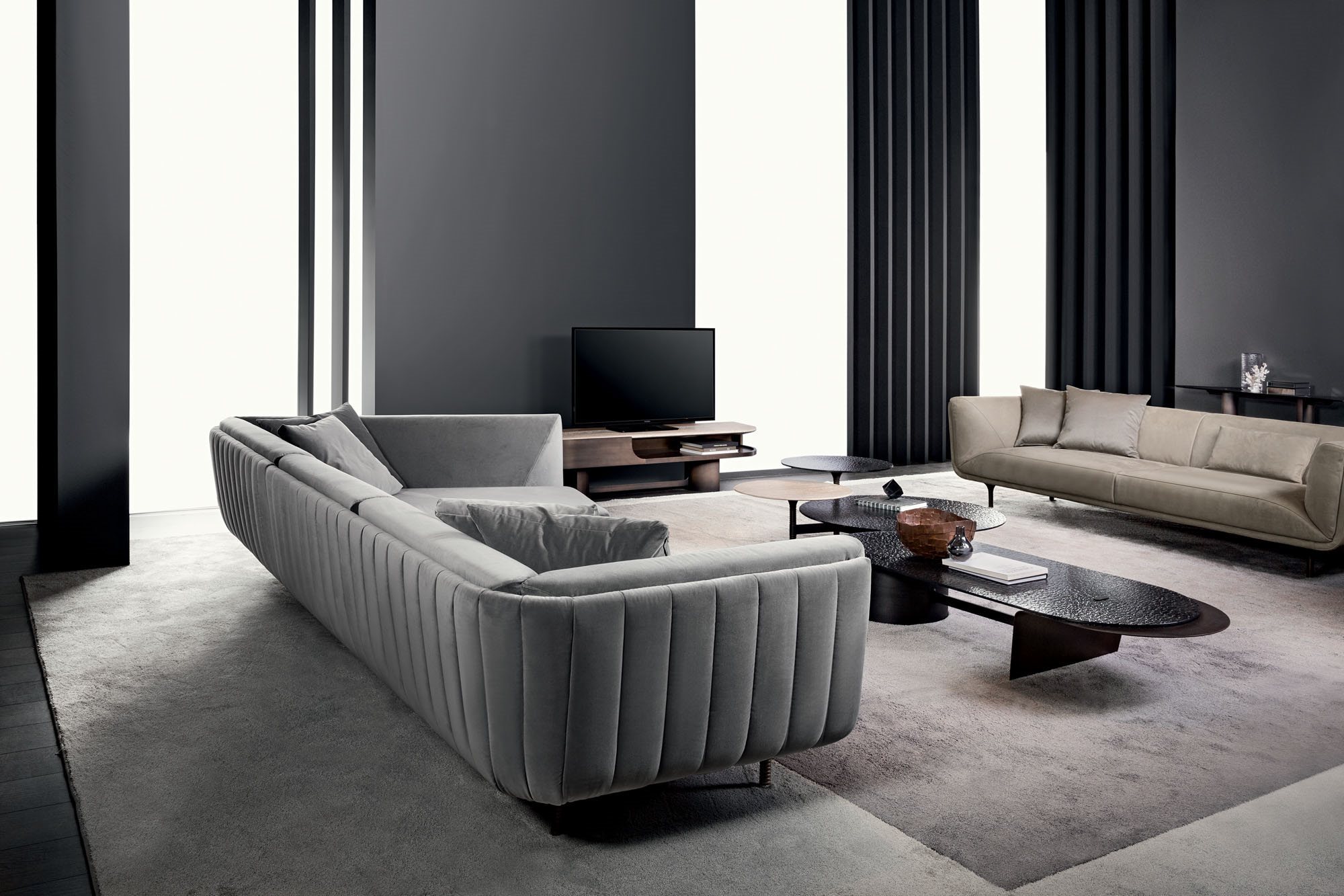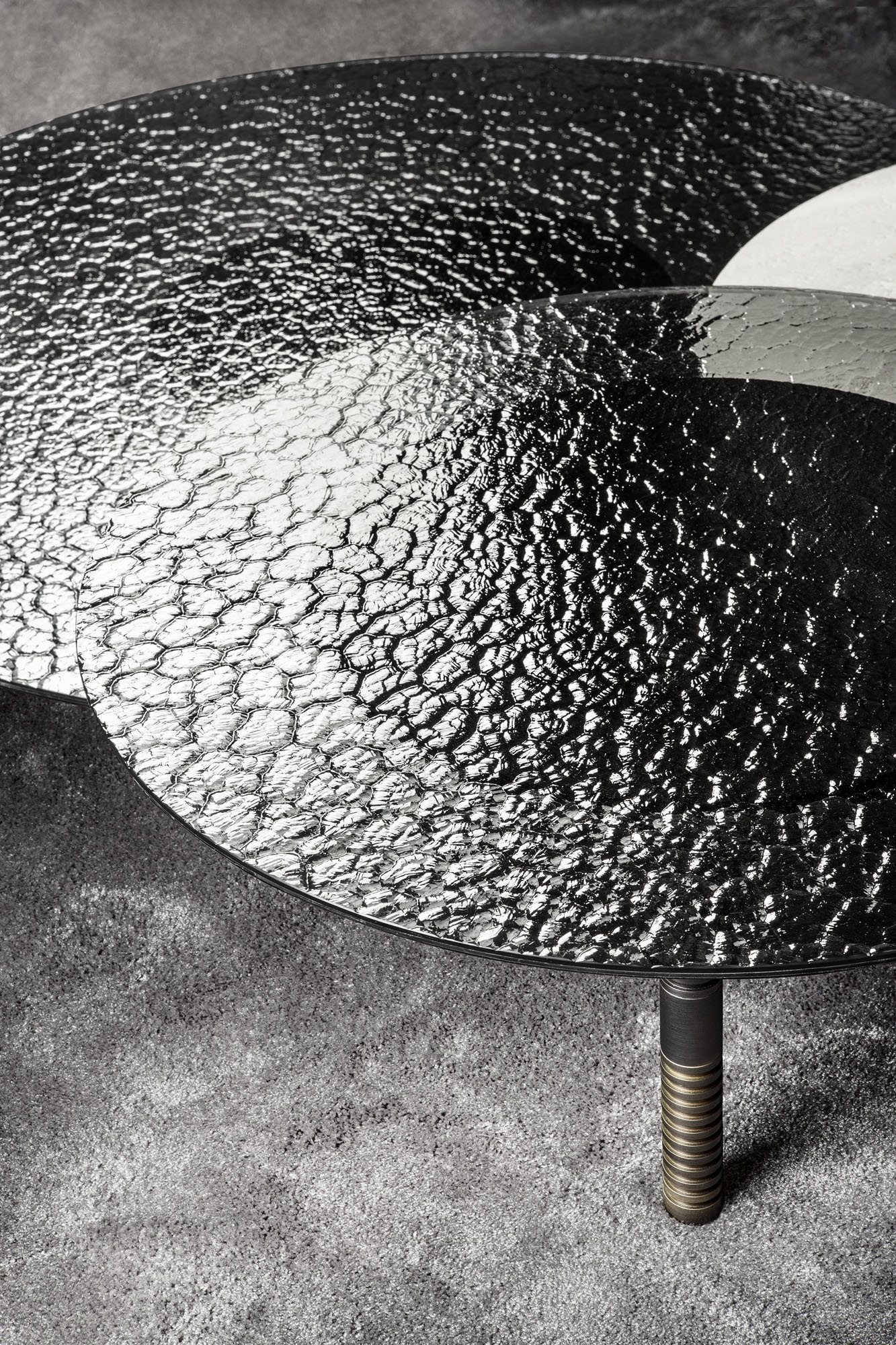 Glass and metal combined create unexpected reflections that reverberate in the tables and in the console of the Premiere collection.