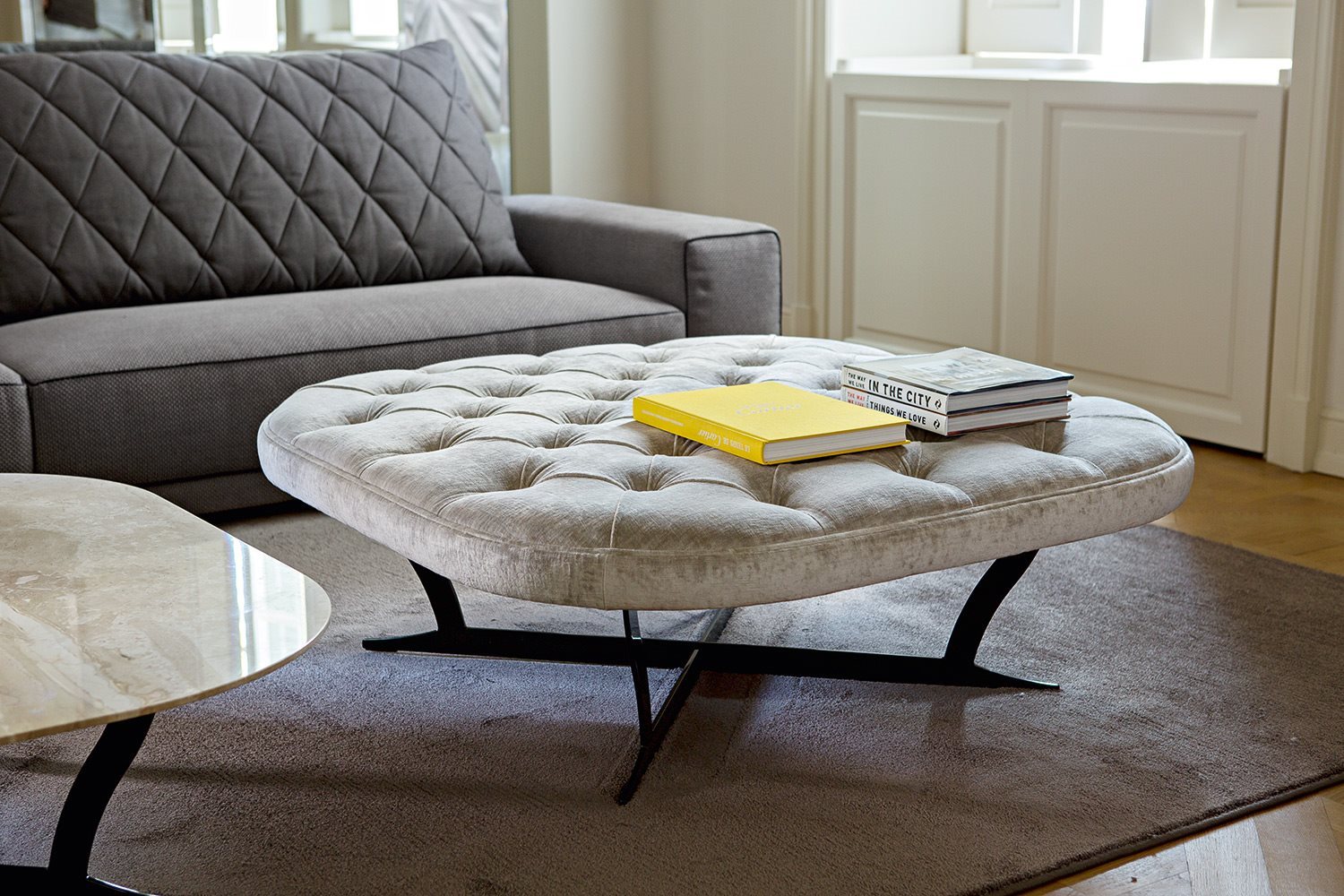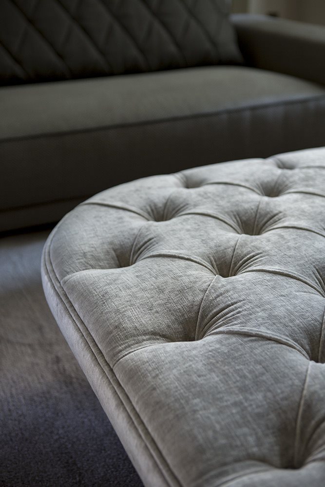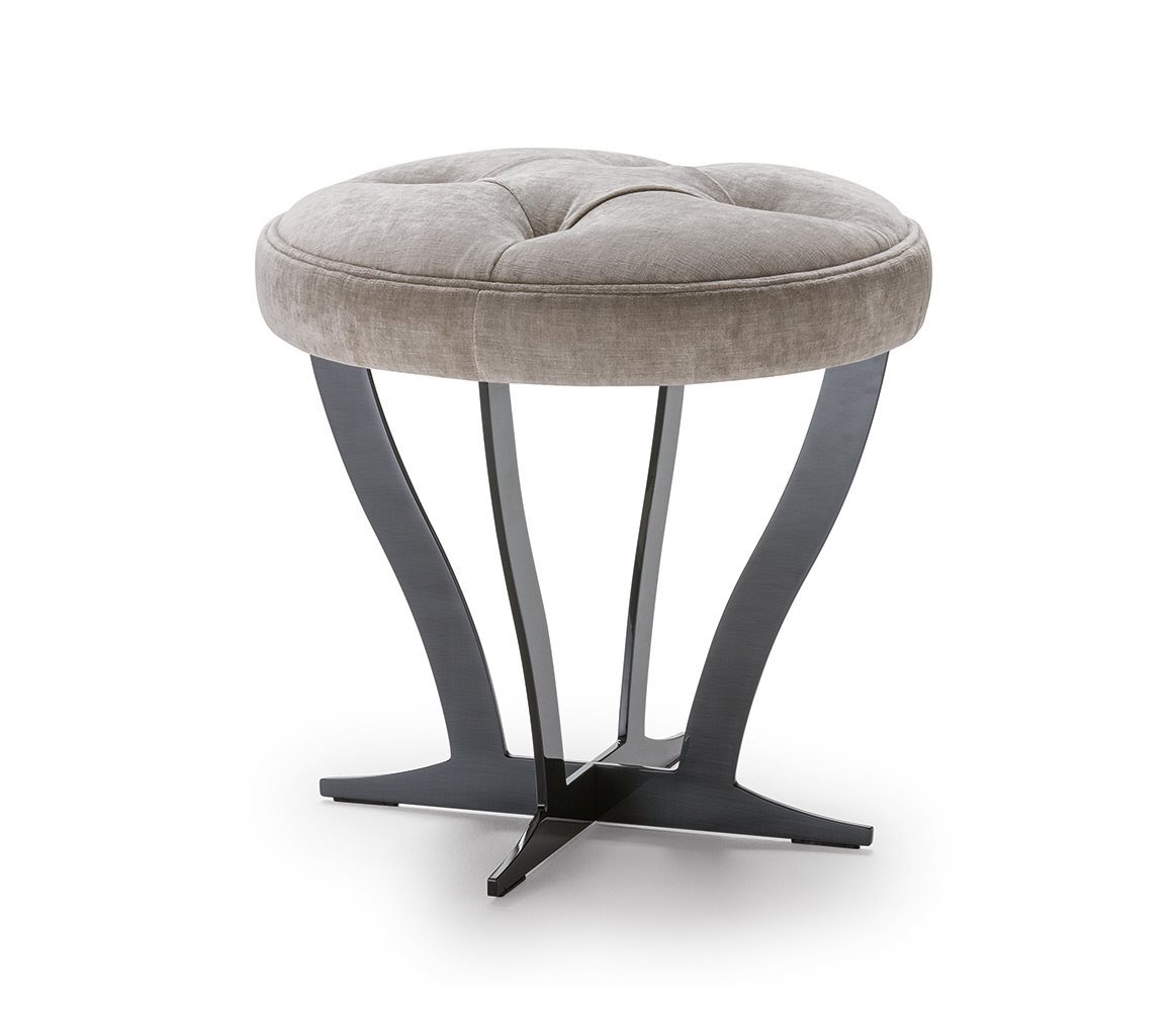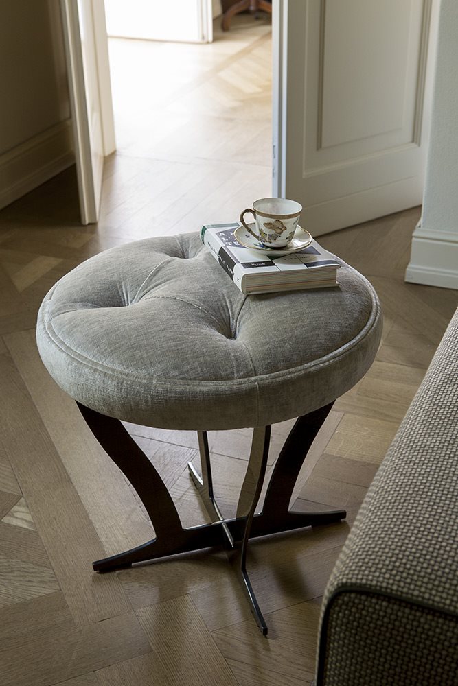 Modern interpretation of the classic quilted for the seat,  metal for the base, upholstered small tables RICHARD (round and square) are at the same time a small seat and a practical top which supports the sofa. Top in fabric and metal base – finishing options: COPPER, BRONZE, BROWNED.