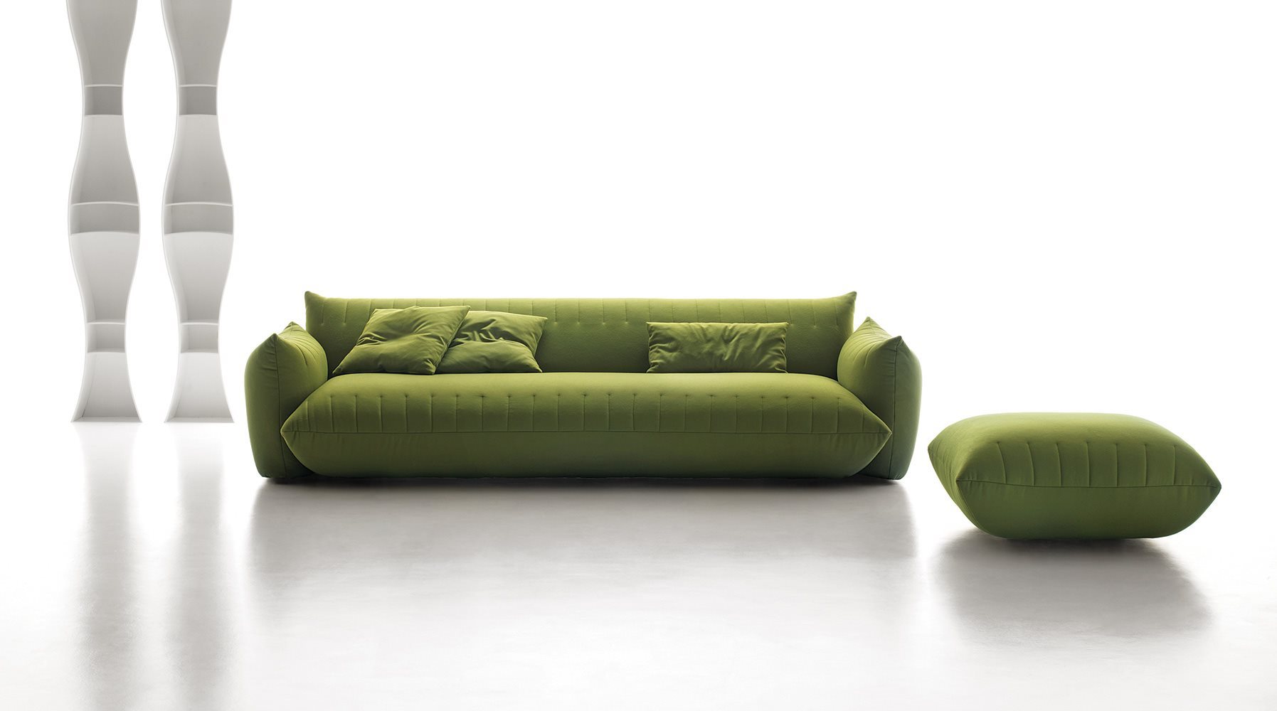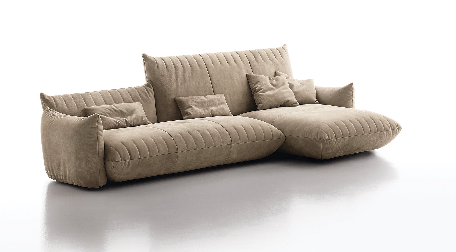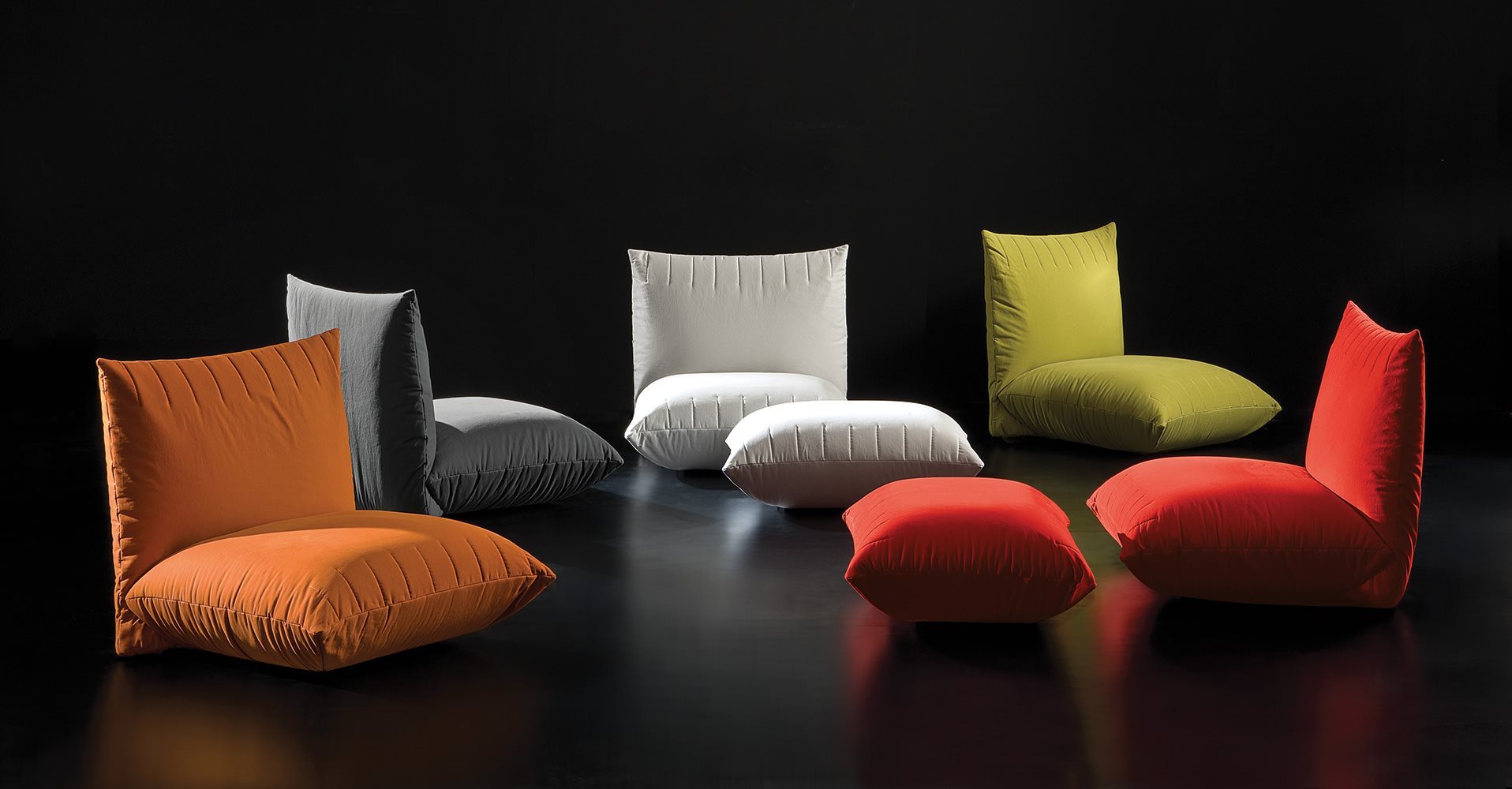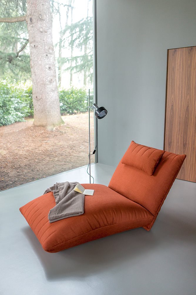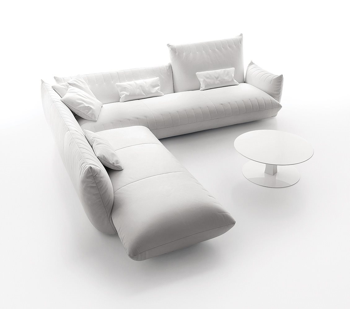 Bellavita is characterized by its soft and rounded shapes that evoke pillows, while the quilted seams on seats, backs and armrests give it a sleek minimalist touch. Highly versatile, its main feature is the great modularity: mix and match two back heights and seats with different widths to create an infinite range of combinations to be completed with poufs and armrests on the left or right. Looks like it’s floating thanks to its concealed feet. The range is completed by small armchairs and a bed available with different headboards.