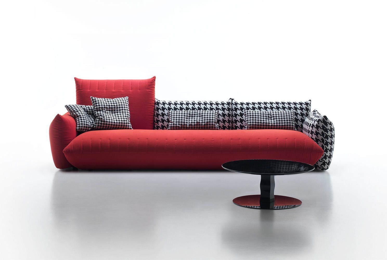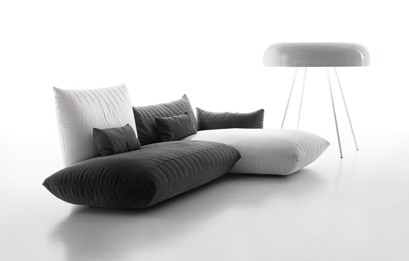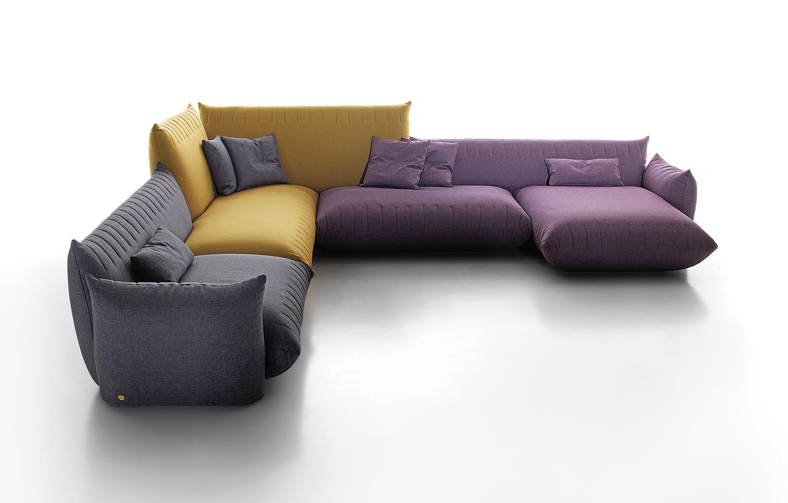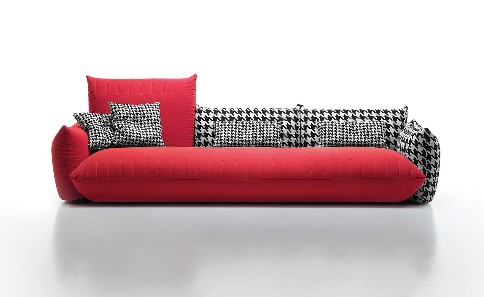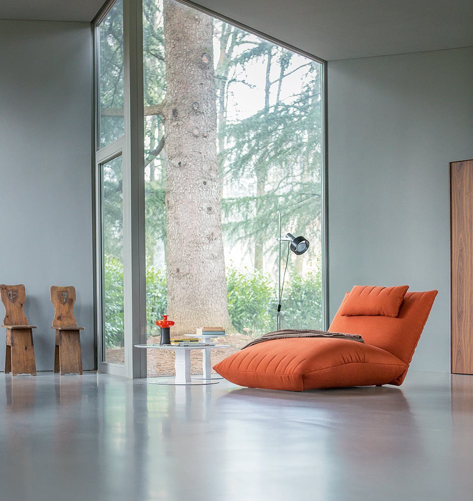 Bellavita is characterized by its soft and rounded shapes that evoke pillows, while the quilted seams on seats, backs and armrests give it a sleek minimalist touch. Highly versatile, its main feature is the great modularity: mix and match two back heights and seats with different widths to create an infinite range of combinations to be completed with poufs and armrests on the left or right. Looks like it’s floating thanks to its concealed feet. The range is completed by small armchairs and a bed available with different headboards.