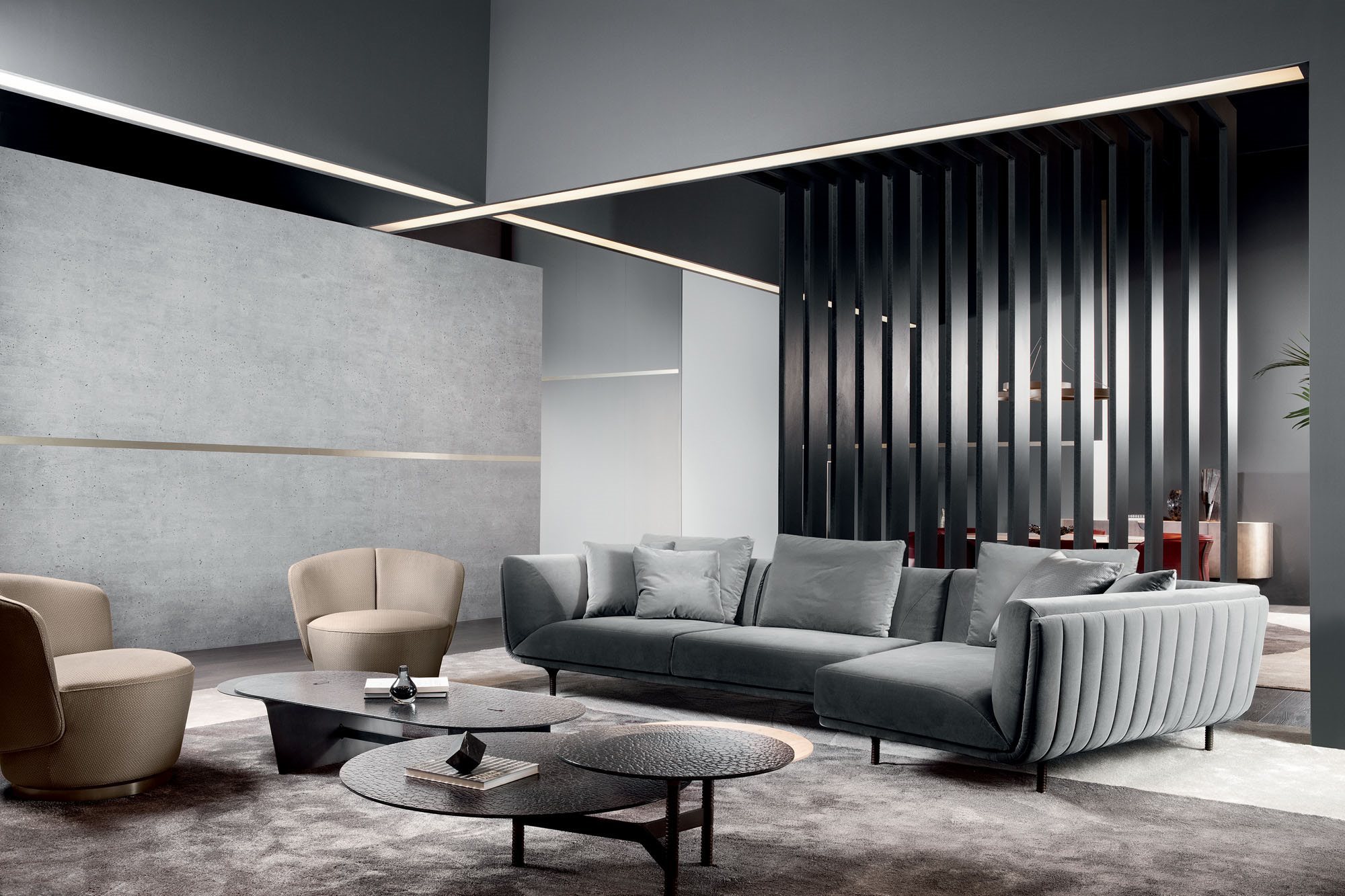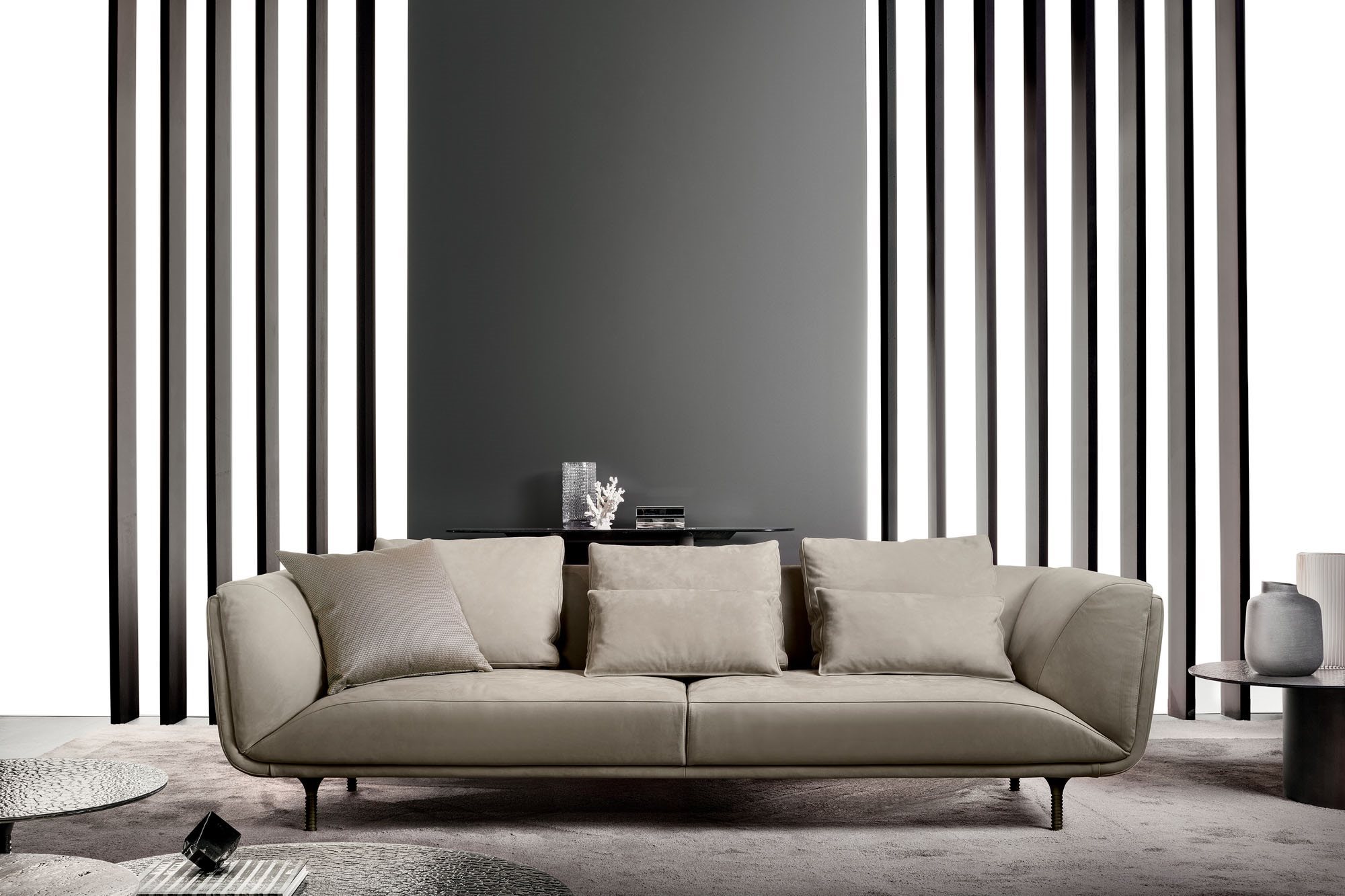 The stylish ribbed stitching of the external backrest contrasts nicely with the horizontal development of the Premiere sofa. Available in either fixed or modular frame versions, its generous size makes it eminently suitable for large rooms.