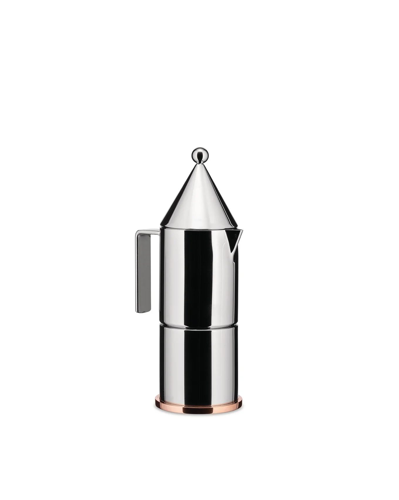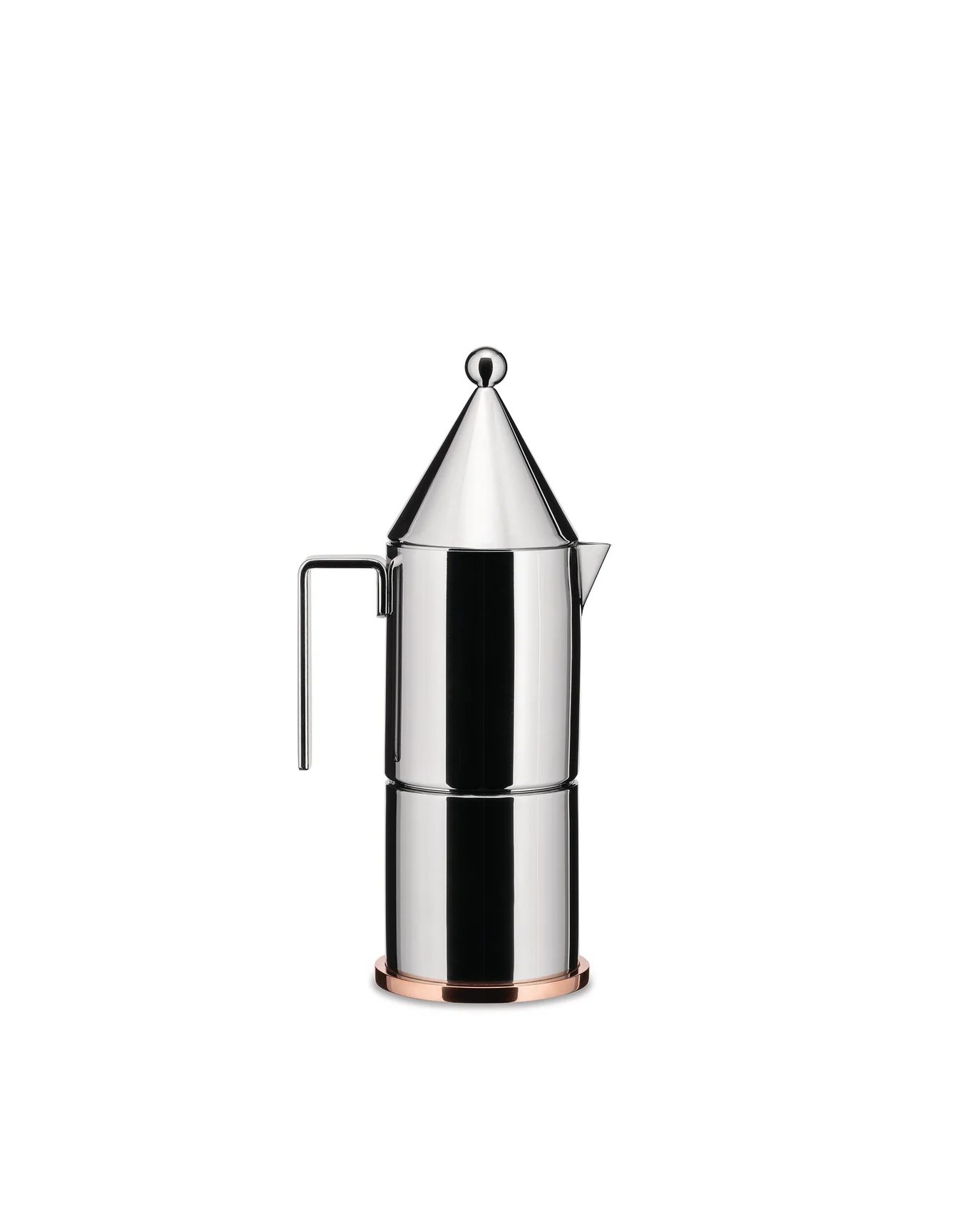 La Conica, the first espresso moka pot designed by Aldo Rossi.embodies the union of simple geometric shapes that form a mini-table architecture with a concise and elegant style.A timeless icon,La Conica boasts a stainless steel body and copper base: asophisticated three or six-cup moka pot characterised by minimalgeometric forms which result in a functional tool with which you canprepare and serve the best coffee.Add initials or personalise LaConica with our personalisation service, available exclusively online.