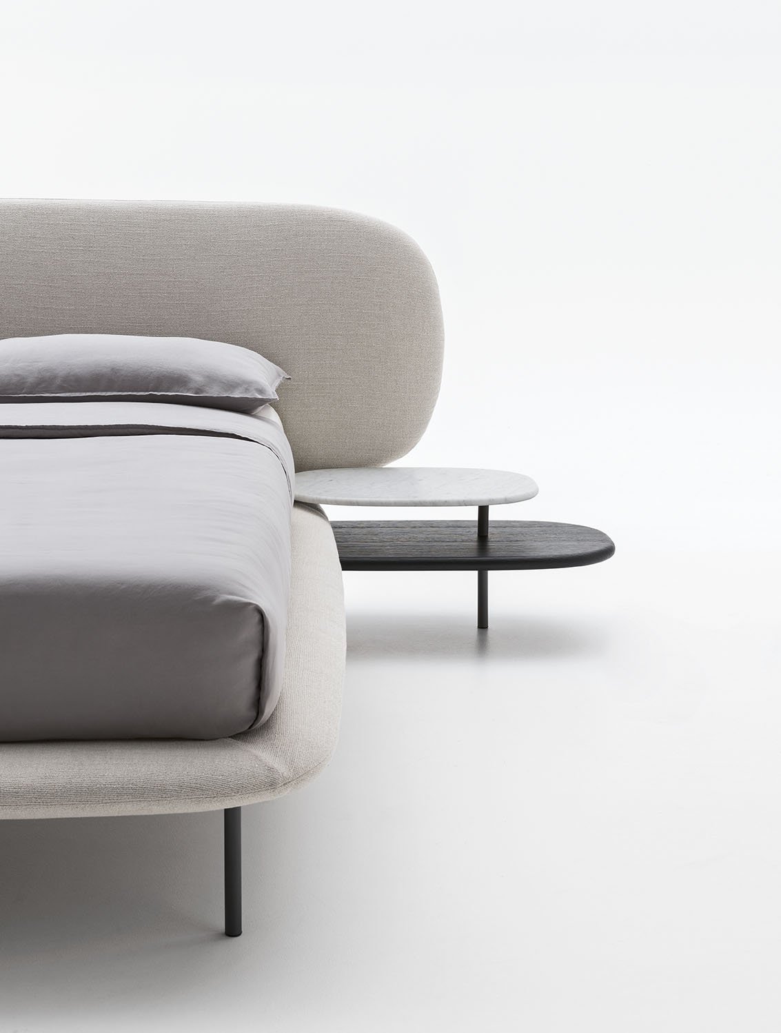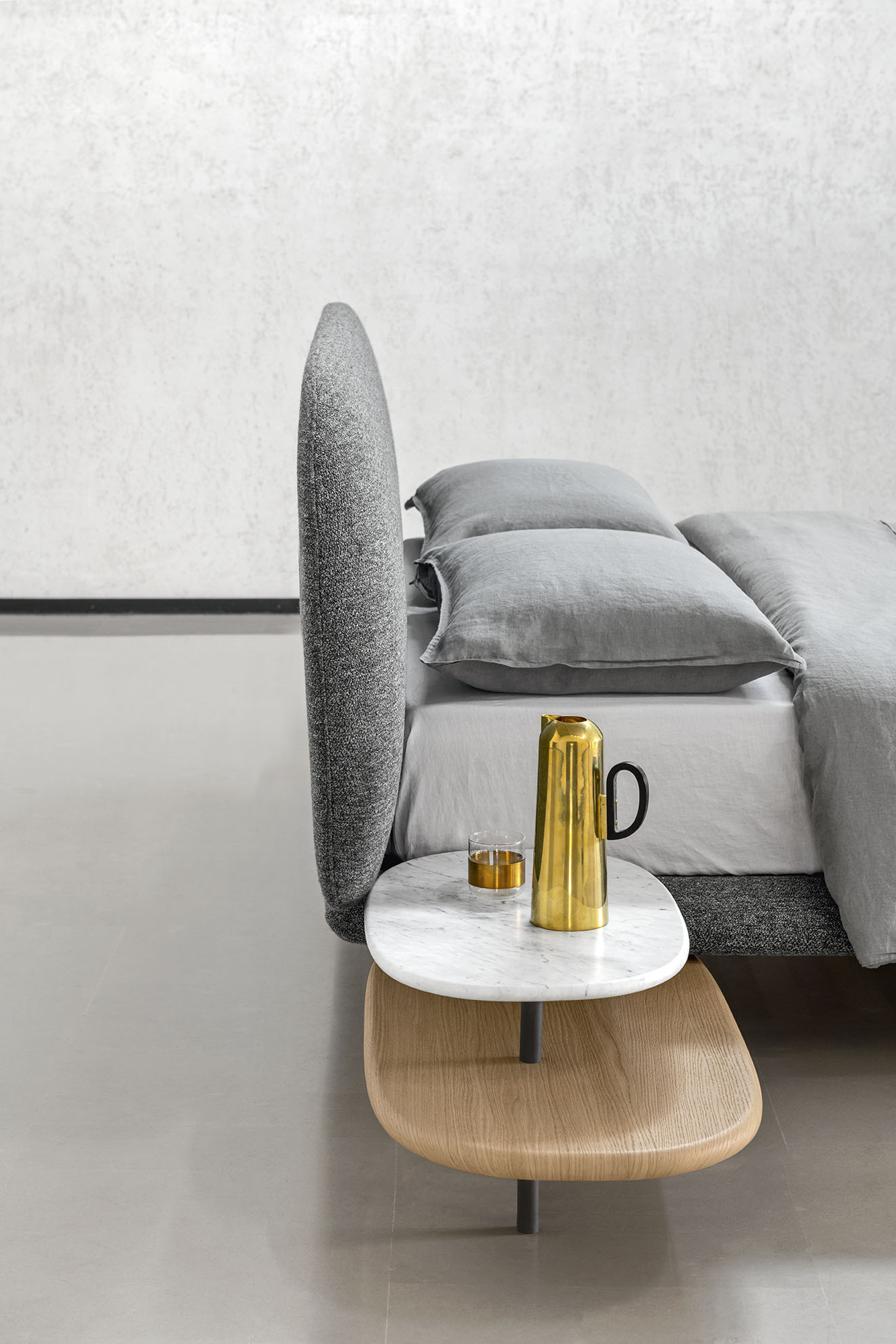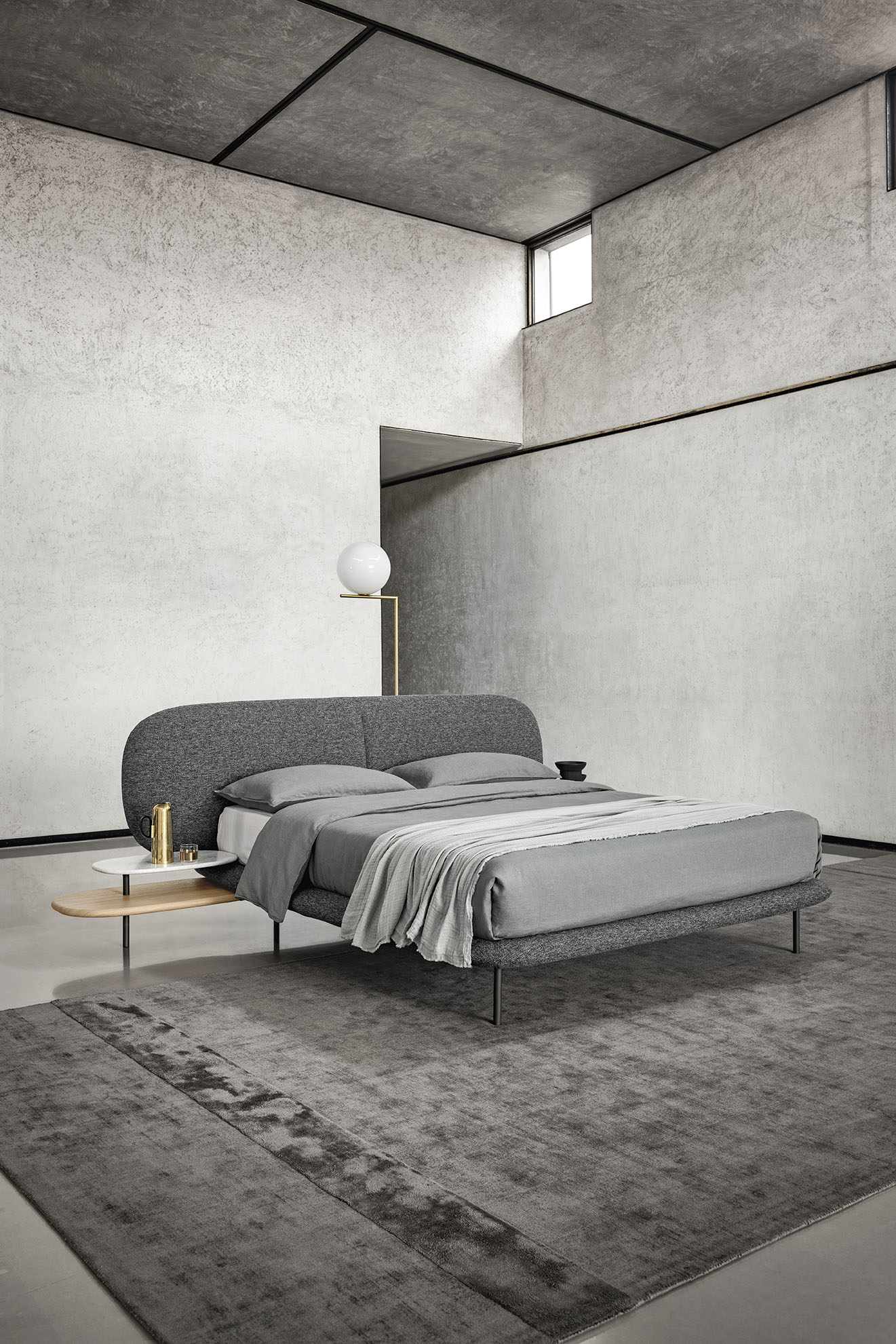The Ney range of beds is inspired by the organic shape of river pebbles, rubbed smooth by the water. The soft design that defines both the padded elements and the double shelves gives the composition the enveloping and functional look of a bed that lacks nothing.