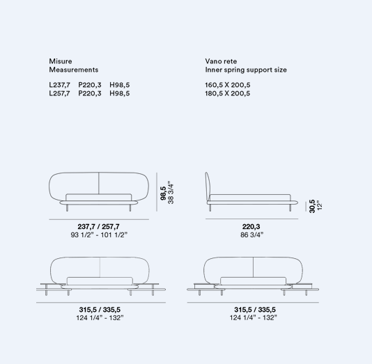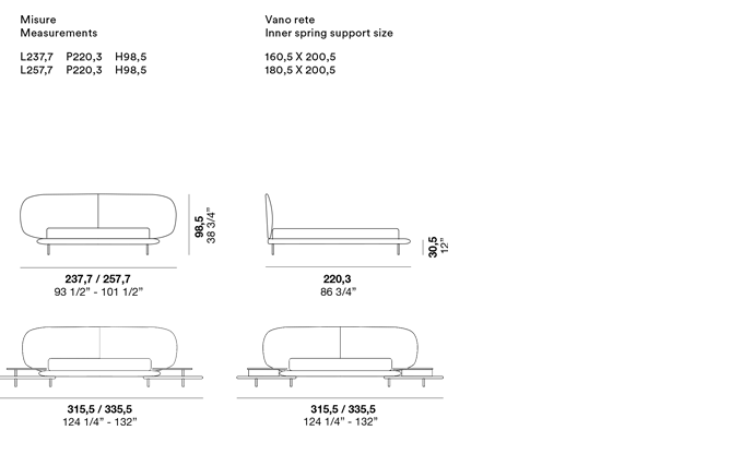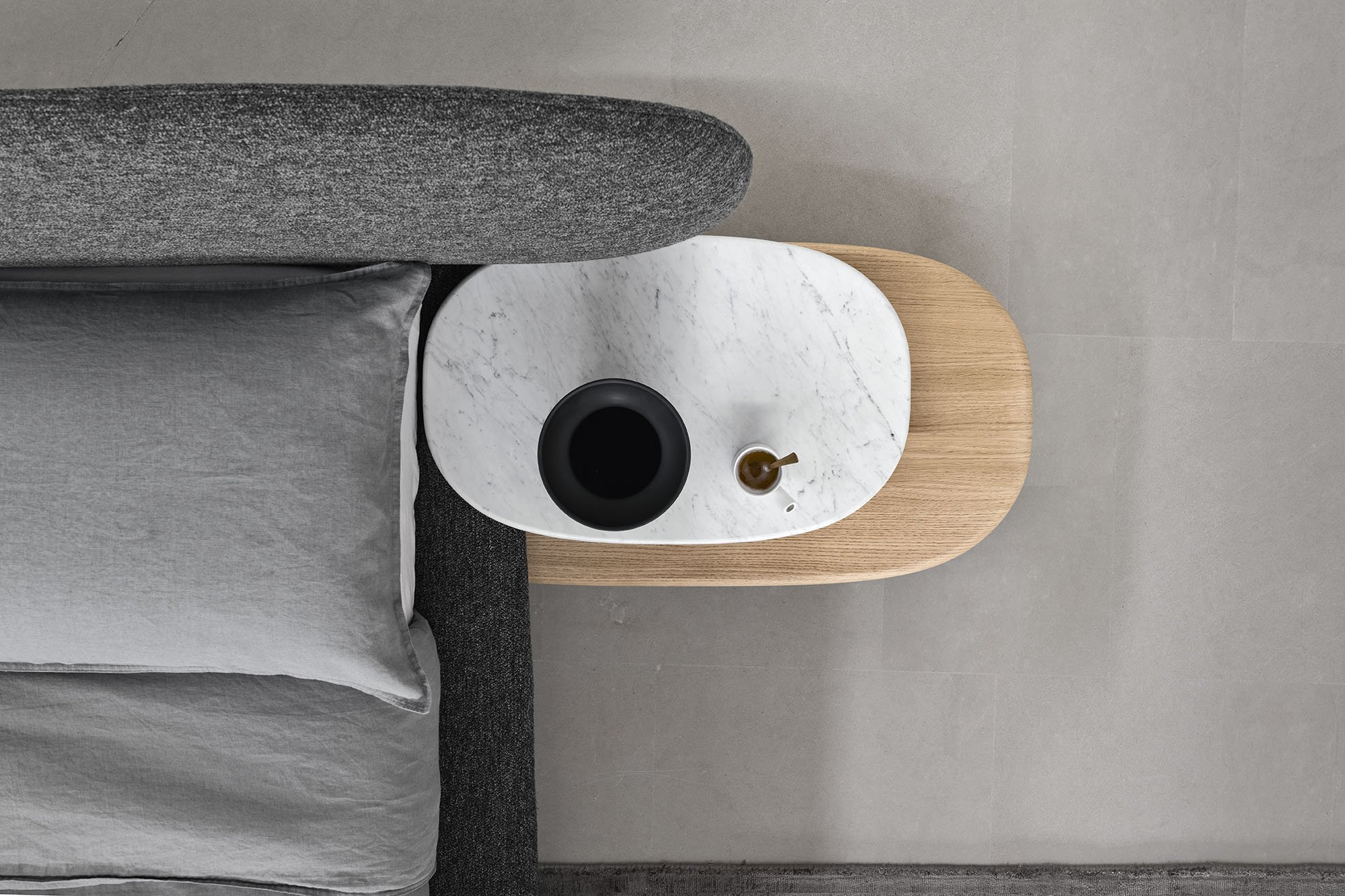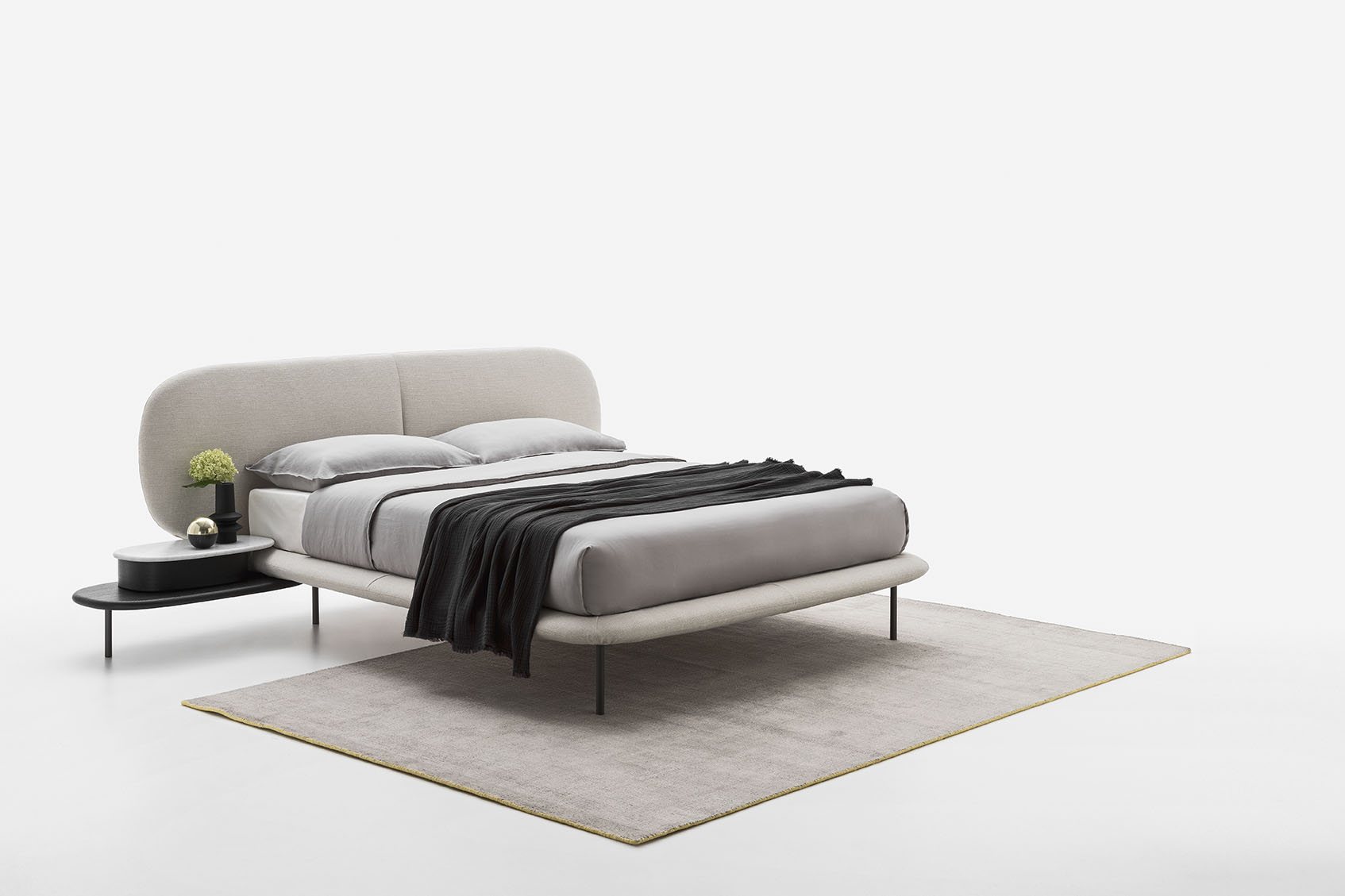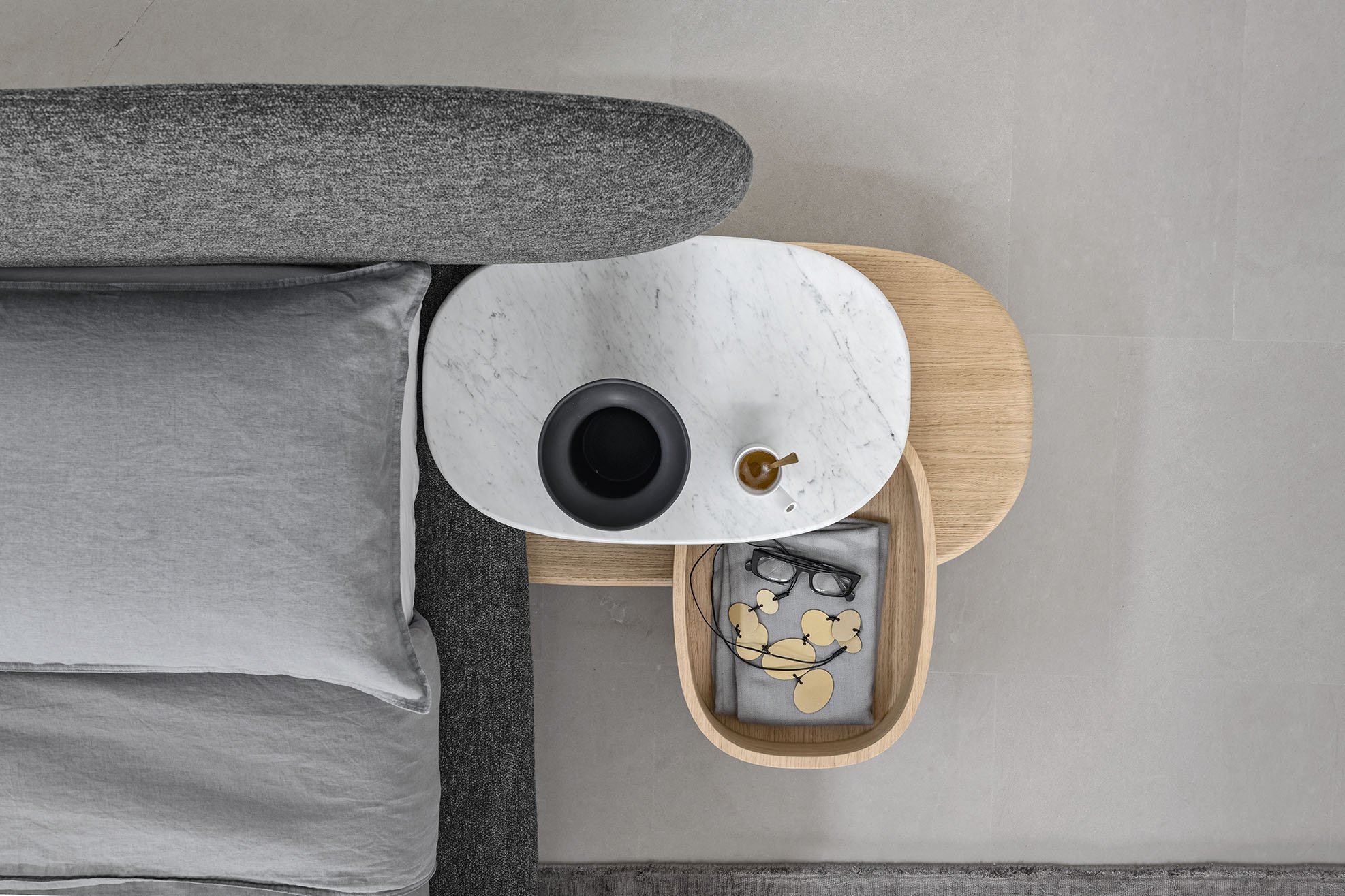 The Ney range of beds is inspired by the organic shape of river pebbles, rubbed smooth by the water. The soft design that defines both the padded elements and the double shelves gives the composition the enveloping and functional look of a bed that lacks nothing.