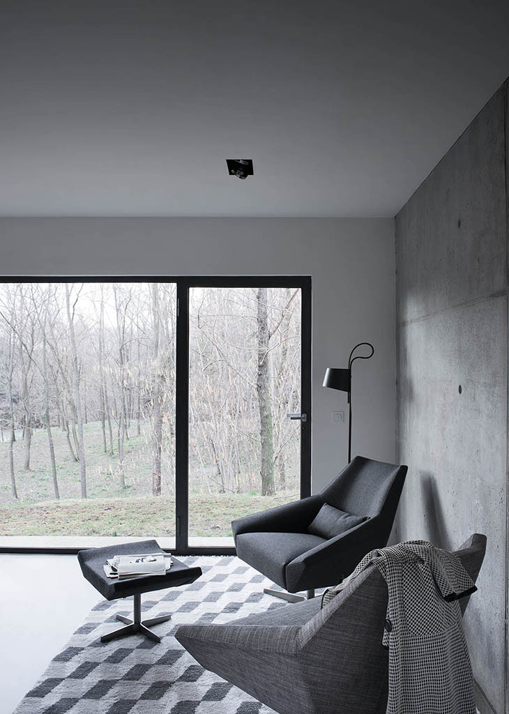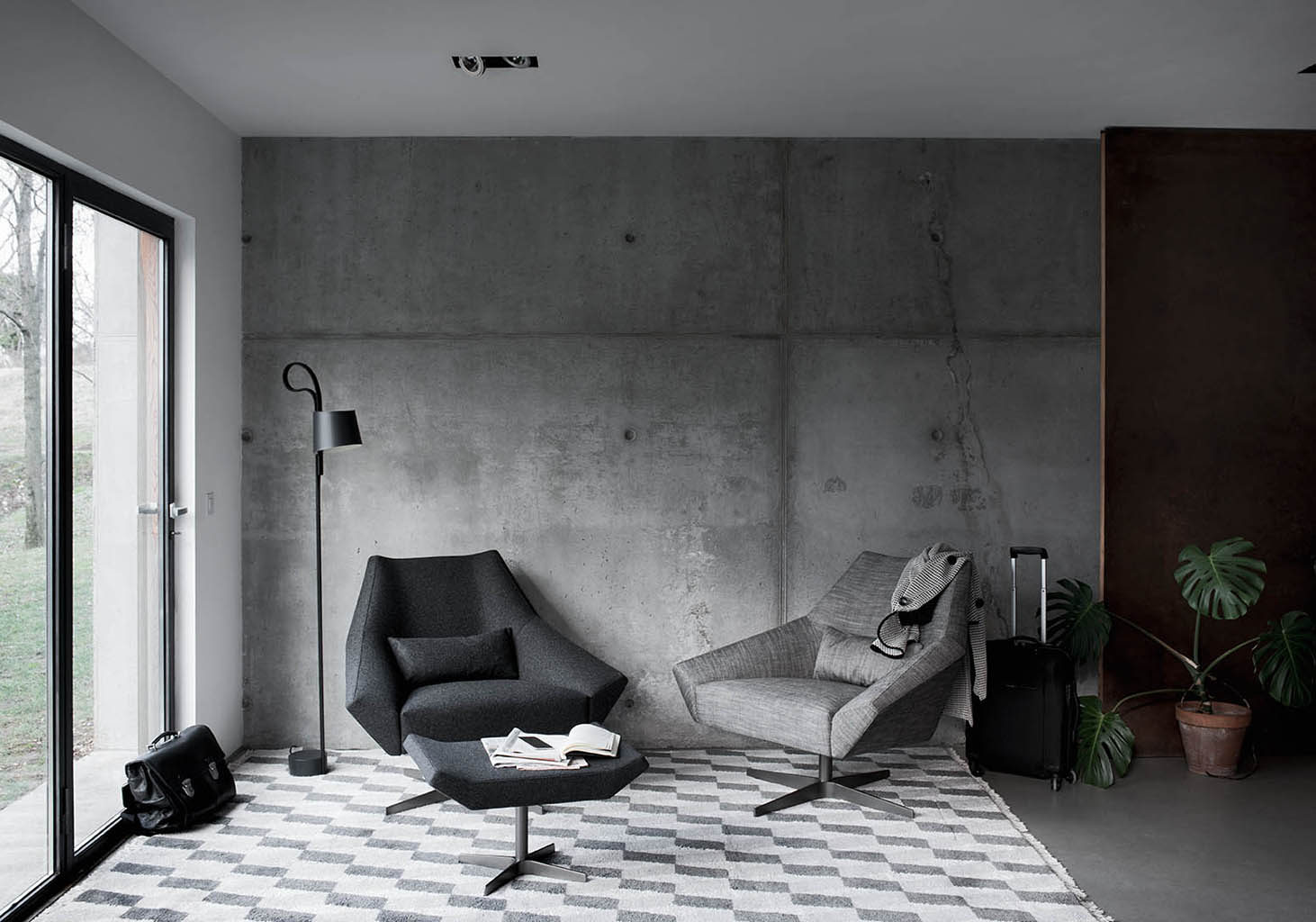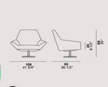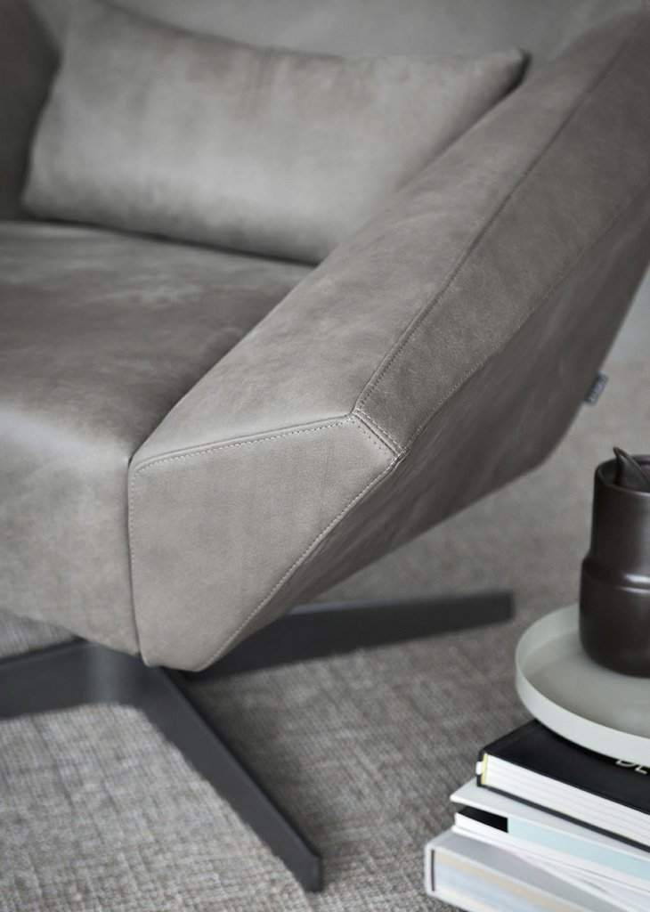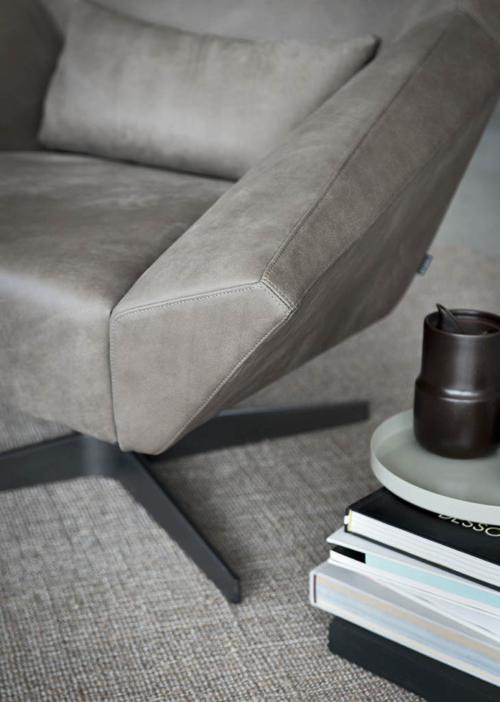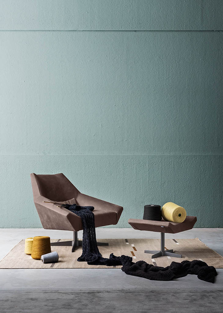 Olivia is a padded armchair and footstool with a metal swivel base. Olivia’s design features an open shape with a hint of distortion to show how it can accommodate all sorts of positions.