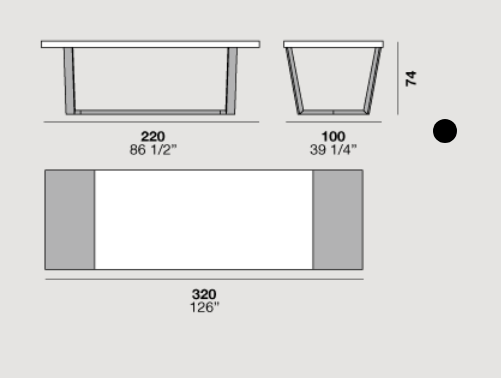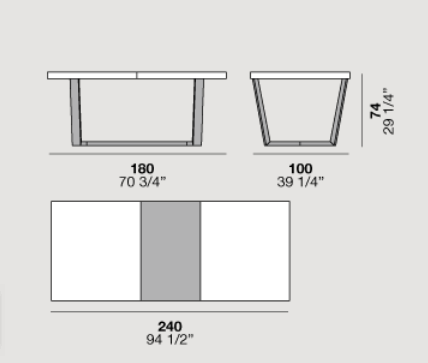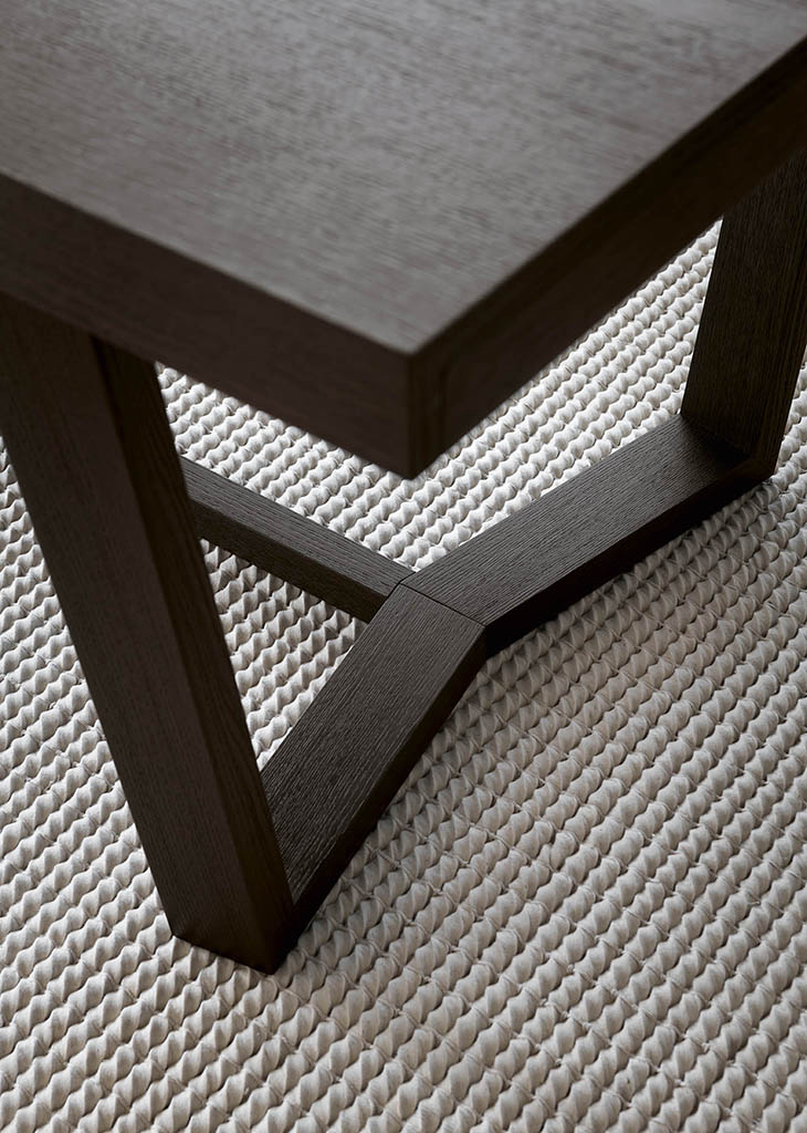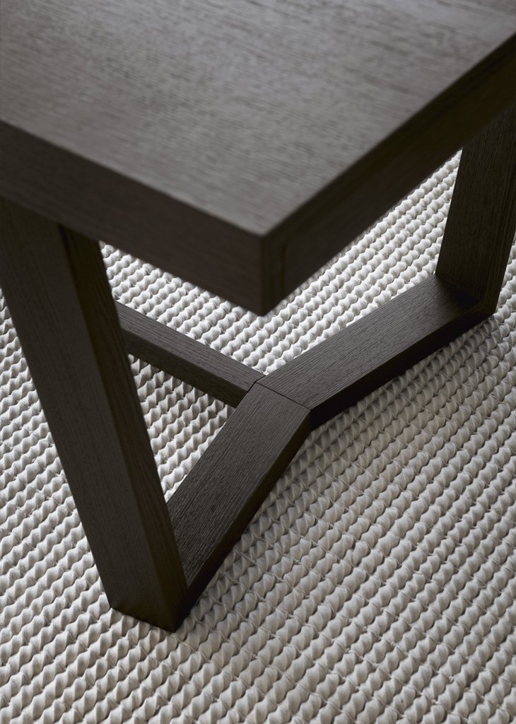 The Cartesio 2.0 table has a rectangular wooden frame and is extendable. Cartesio 2.0 stands out for its extra thick table top and extensions and for the unusual shape of the base, in which sloping legs join at the bottom to form a closed structure.