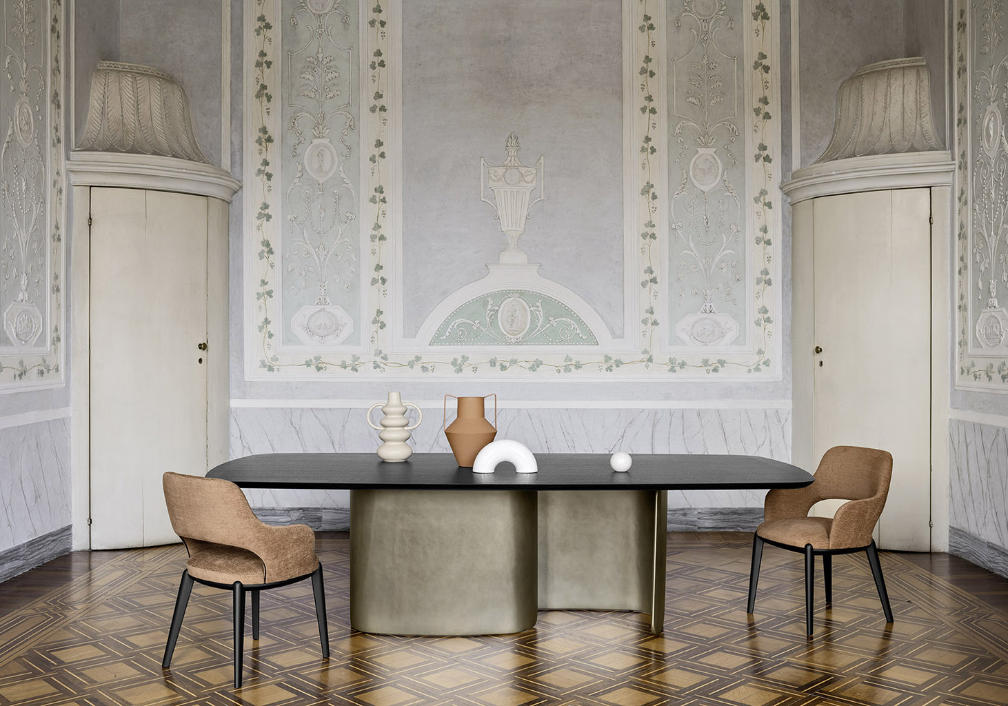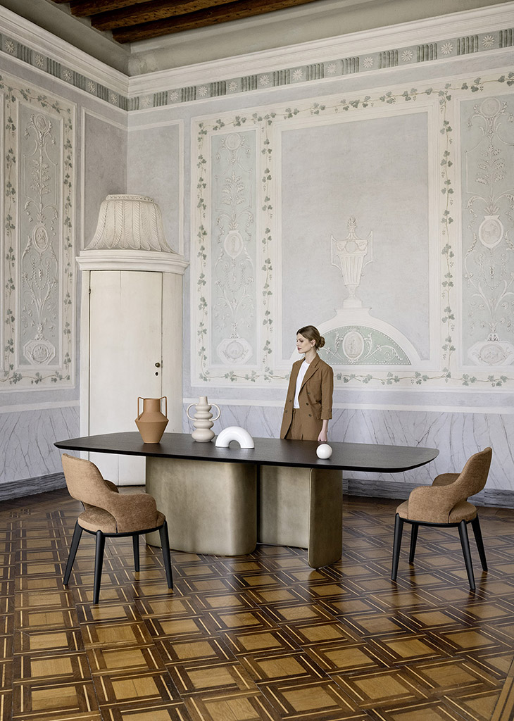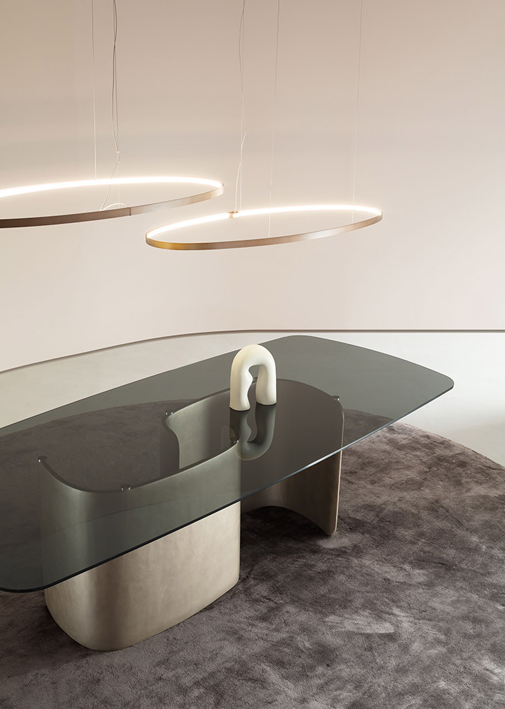 A simple yet expressive table. The base is made up of two symmetrical curved elements made of high-density polyurethane which support the glass or Fashion Wood top.