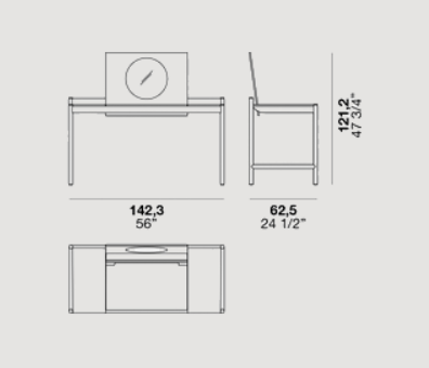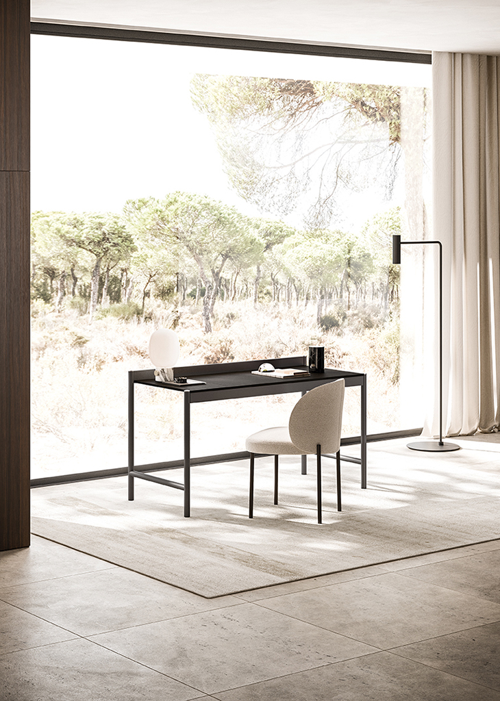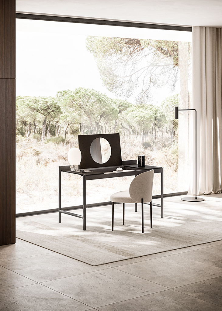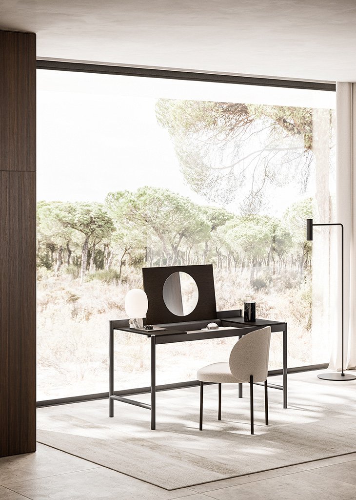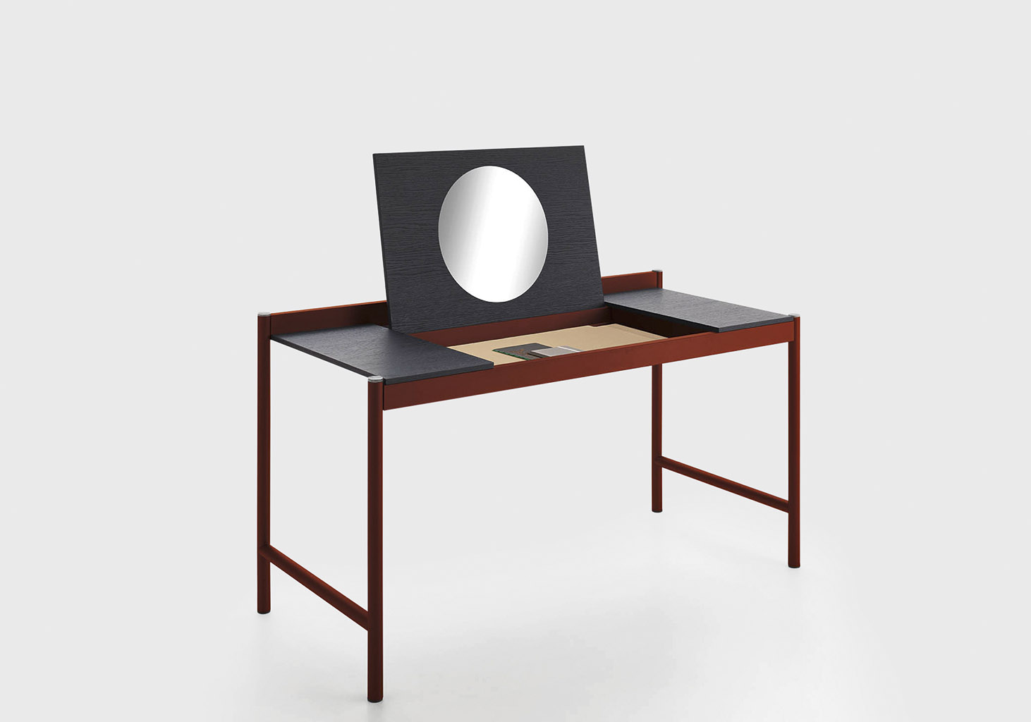 Yukio is a desk with a metal frame and a wooden top that can open to reveal a compartment to hold objects