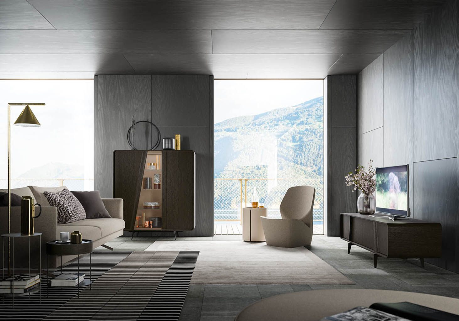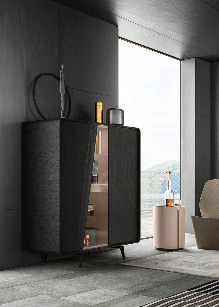 Musa is available as a sideboard, cabinet or display cabinet, and its main feature is the rounded shape of its carcass. It also stands out for the sloping cut of the doors that conceal the handle and continue in the lines of the painted metal feet. The interior can be lacquered and fitted – in the sideboard version – with a practical drawer unit.
