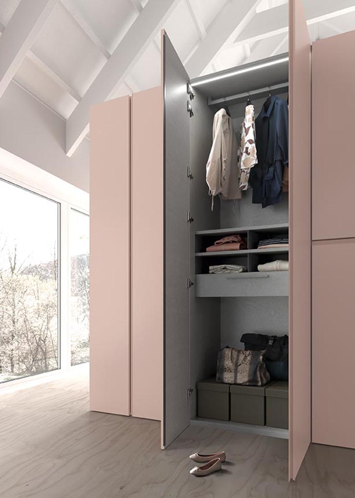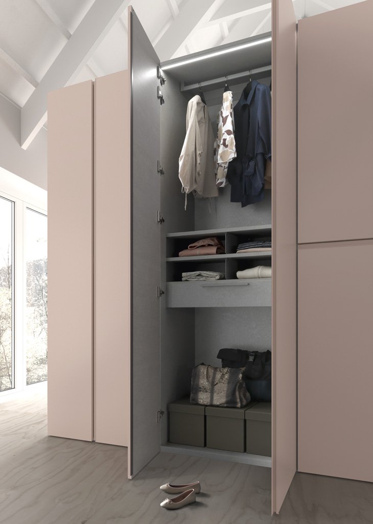 Orizon is a door designed for seasonal swinging wardrobes. This particular configuration features a horizontal handle profile that not only provides easy opening but also divides the door into two parts.