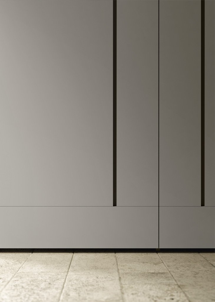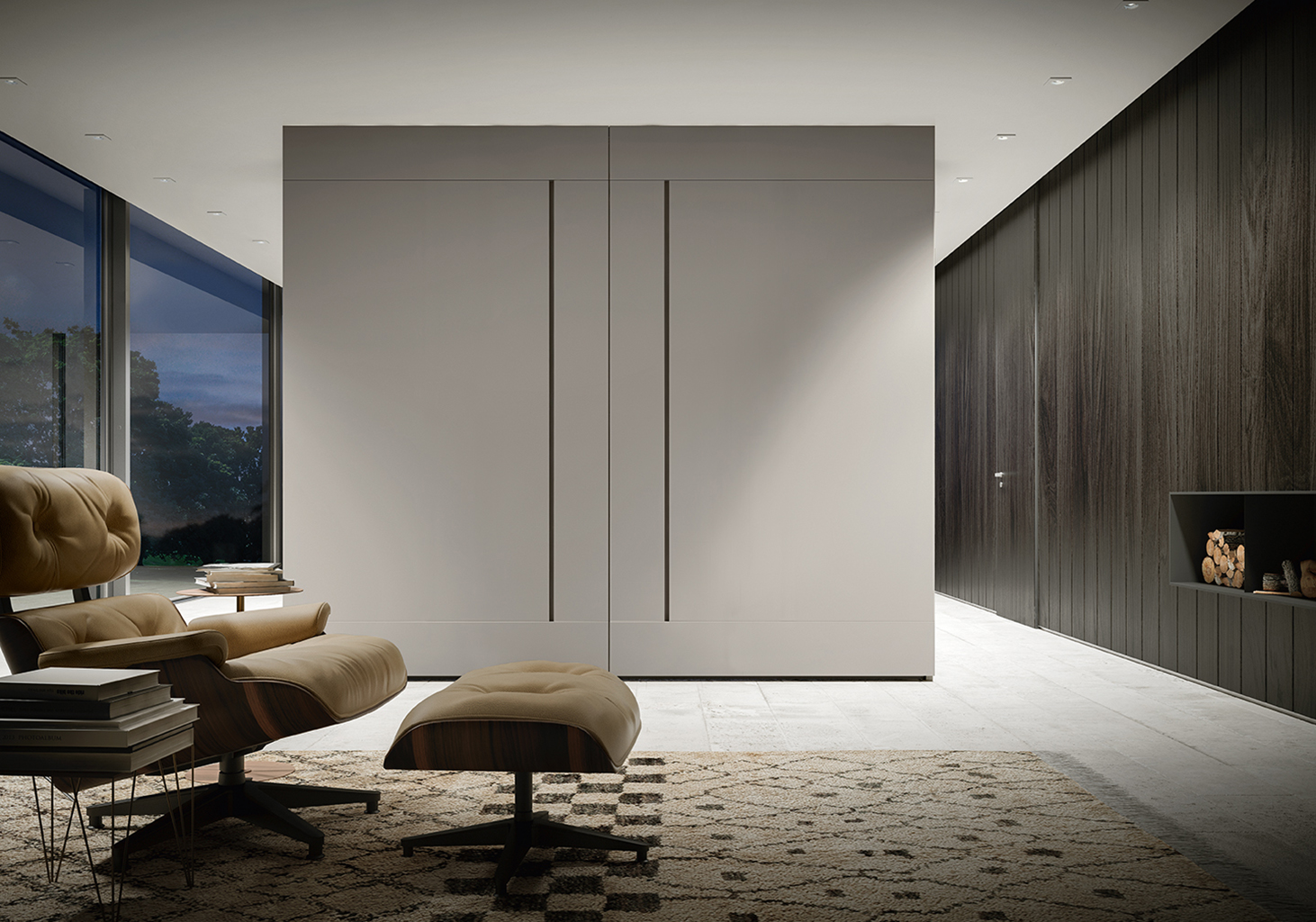 Glide is a coplanar wardrobe made up of several panels, whose combination creates the handle for opening.