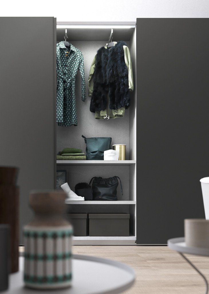 Available in swinging and sliding versions, it can also be combined with modules with drawers with the groove profile running horizontally.