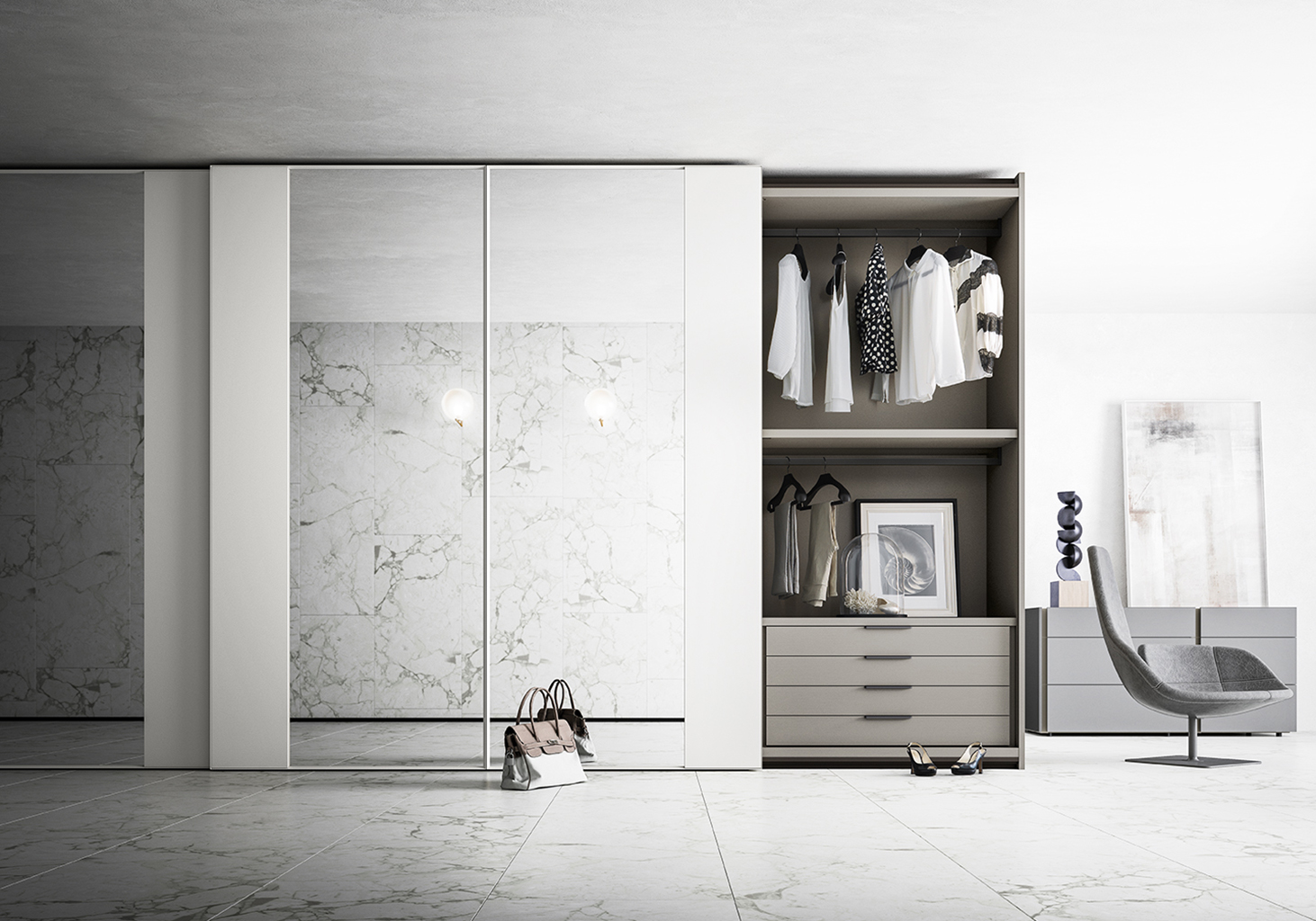 Frame is a wardrobe with sliding door that combines two contrasting finishes. Available in multiple finishes, even with silk-screened glass.