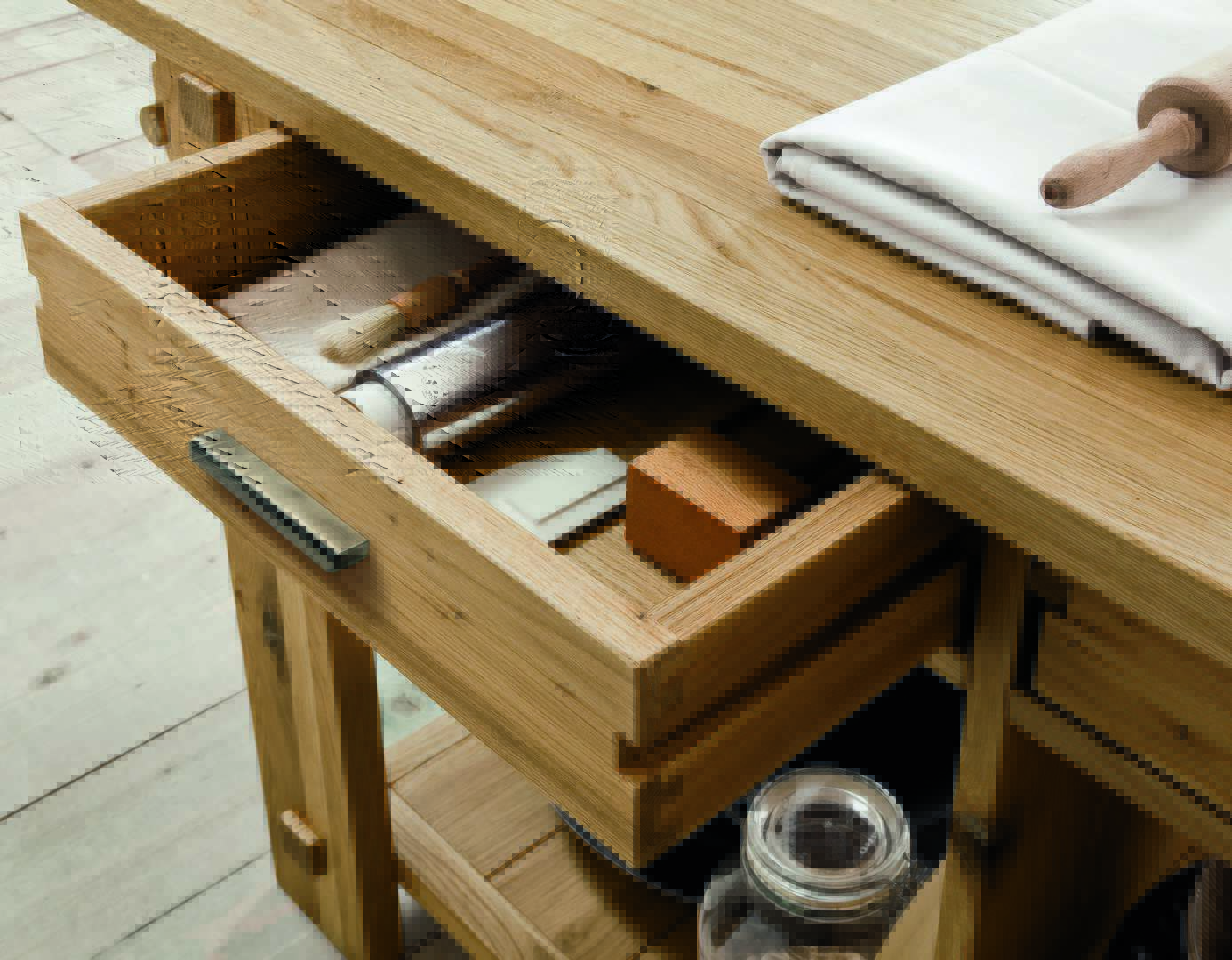 Kitchen Island is entirely made in solid oak, with open compartments and drawers with satin pewter handle.