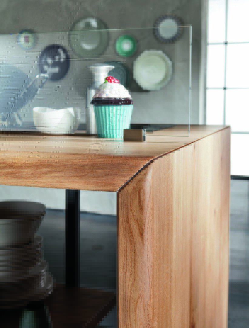 A 60 mm thick top in solid oak, with uneven edges, hand-planed surface, in Alaska finish.