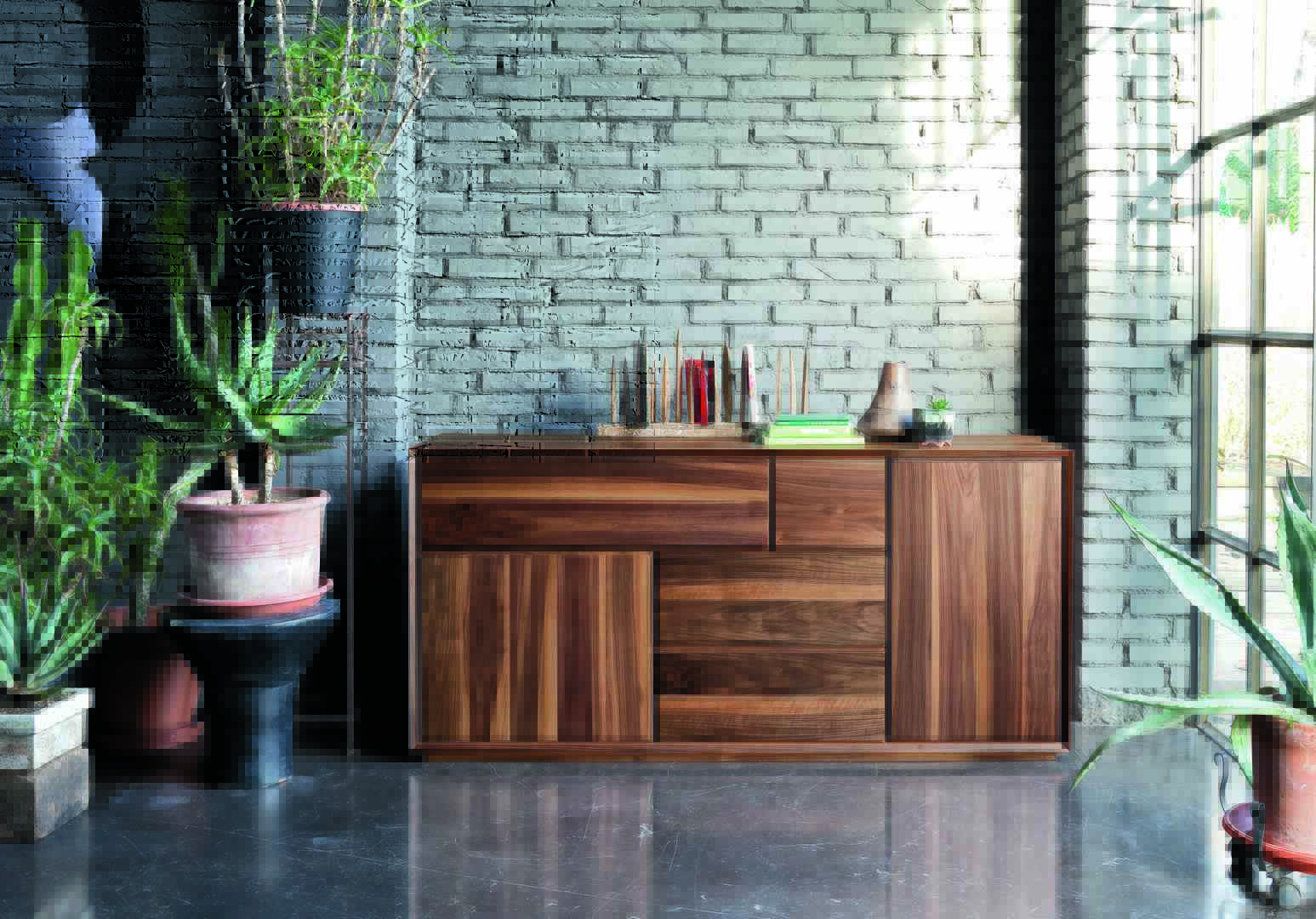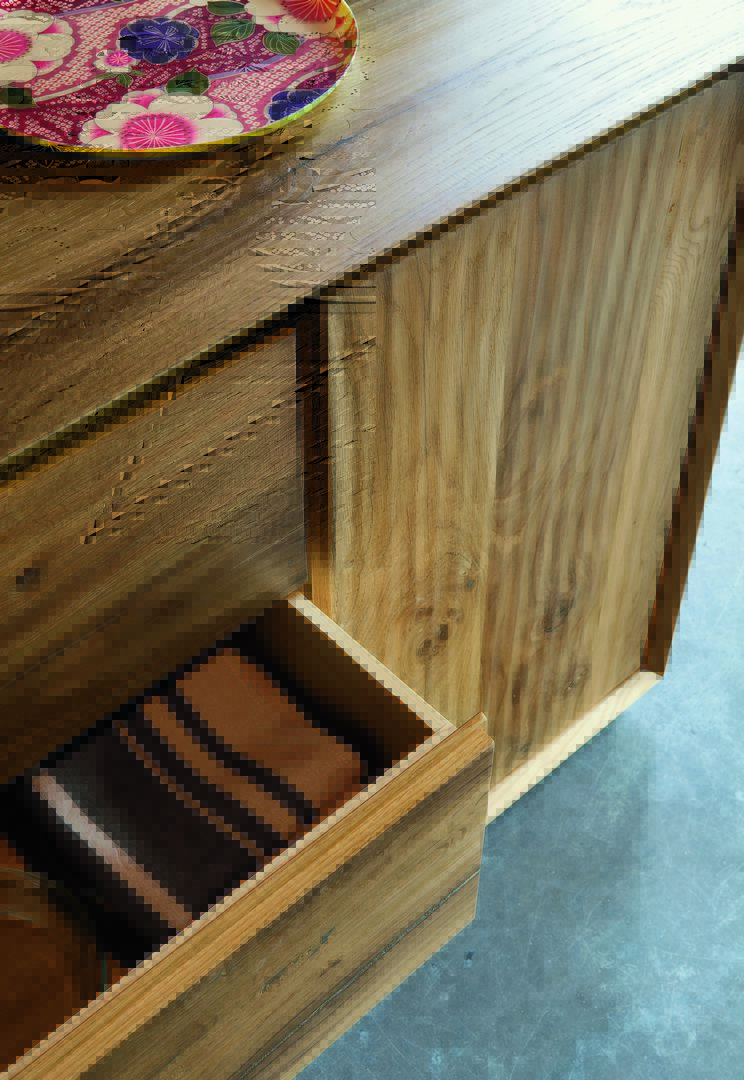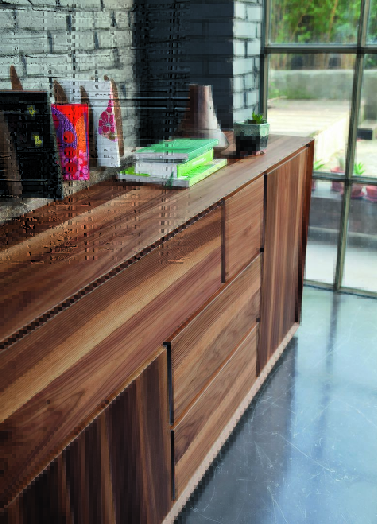 Sideboard in Natural walnut finish with various compartments of different sizes.