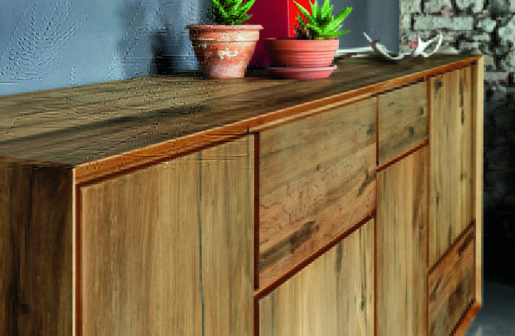 In this section of the sideboard with 655mm high, we can see the walnut sideboard, with Industry finish open compartment and the Rovere Vecchio sideboard with Azzurro Vintage open compartment.