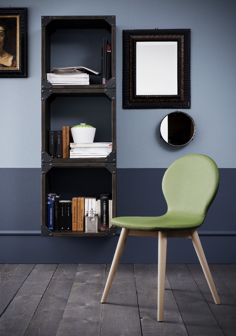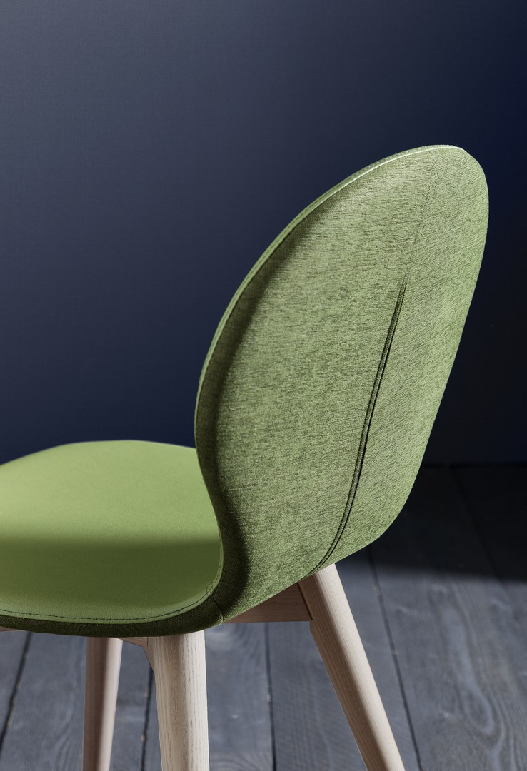 Nina chair is in the EasyLab collection and it has wood legs and seat is eco-leather in the front and fabric in the back. Legs are available in the finishes of EasyLab collection (cenere, bianco, cappuccino and nero); the seat is available in E5, E11, E12, ET12 and, as in the photo, ET11.