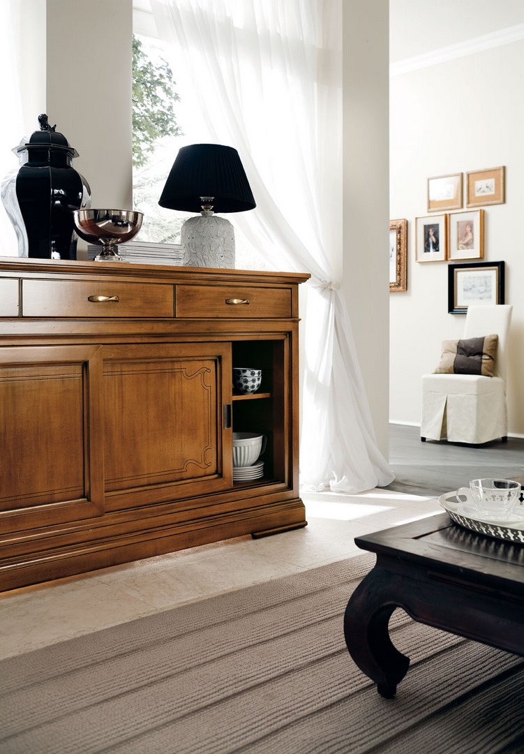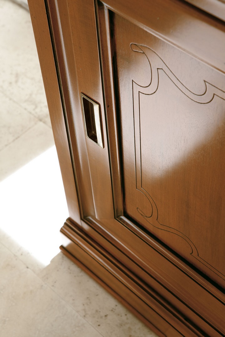 Sideboard in solid limewood and tanganyika walnut, with wooden shelf, three exterior drawers and two sliding doors; the doors are embellished with the characteristic Margherita collection engraving.