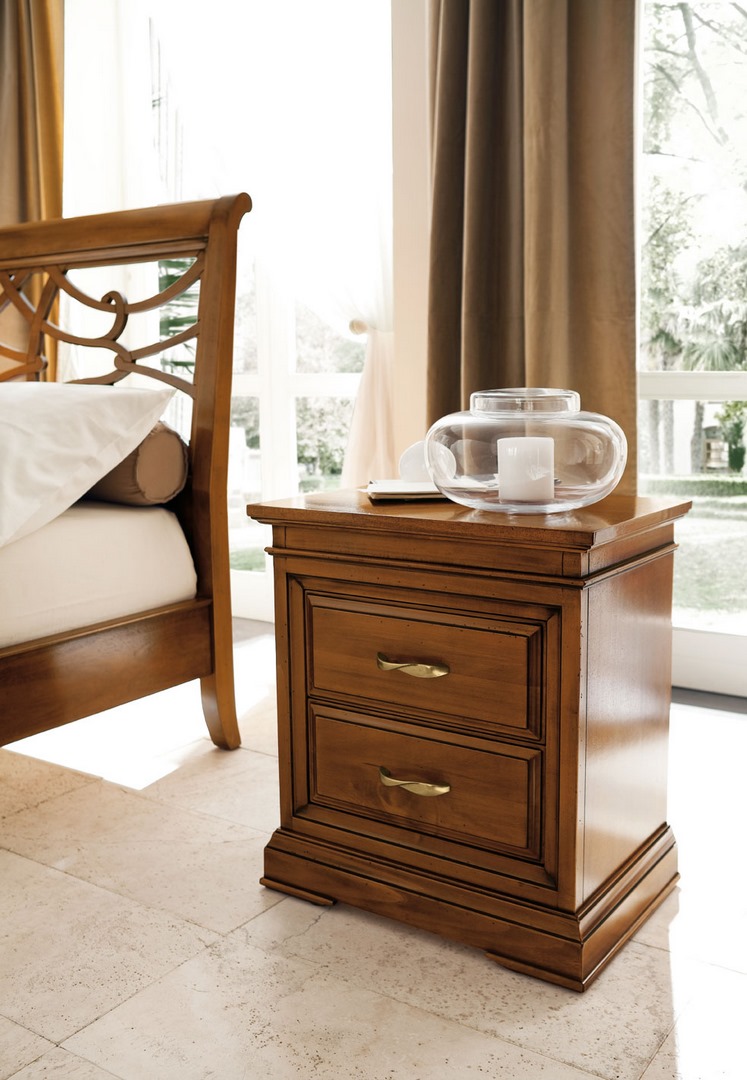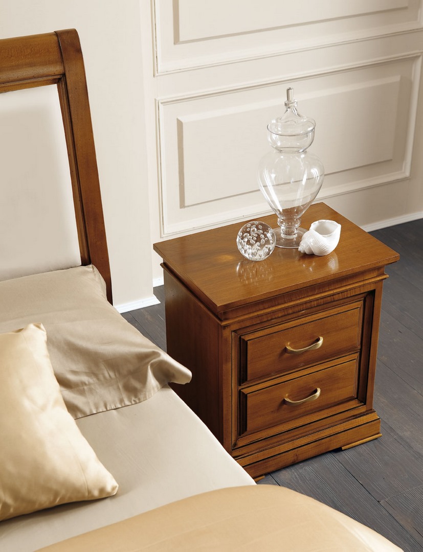 Bedside table in limewood, with two drawers and gilded handles.
