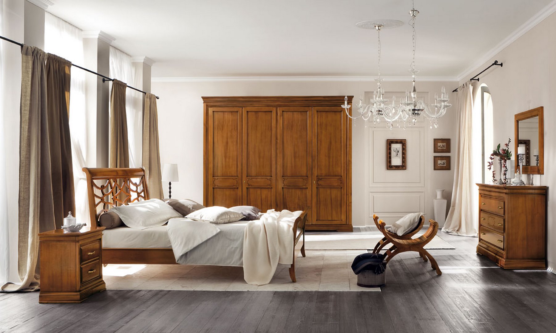 Accompanied by a wardrobe with four doors, 2-drawer bedside tables and a 3-drawer chest, all in limewood.