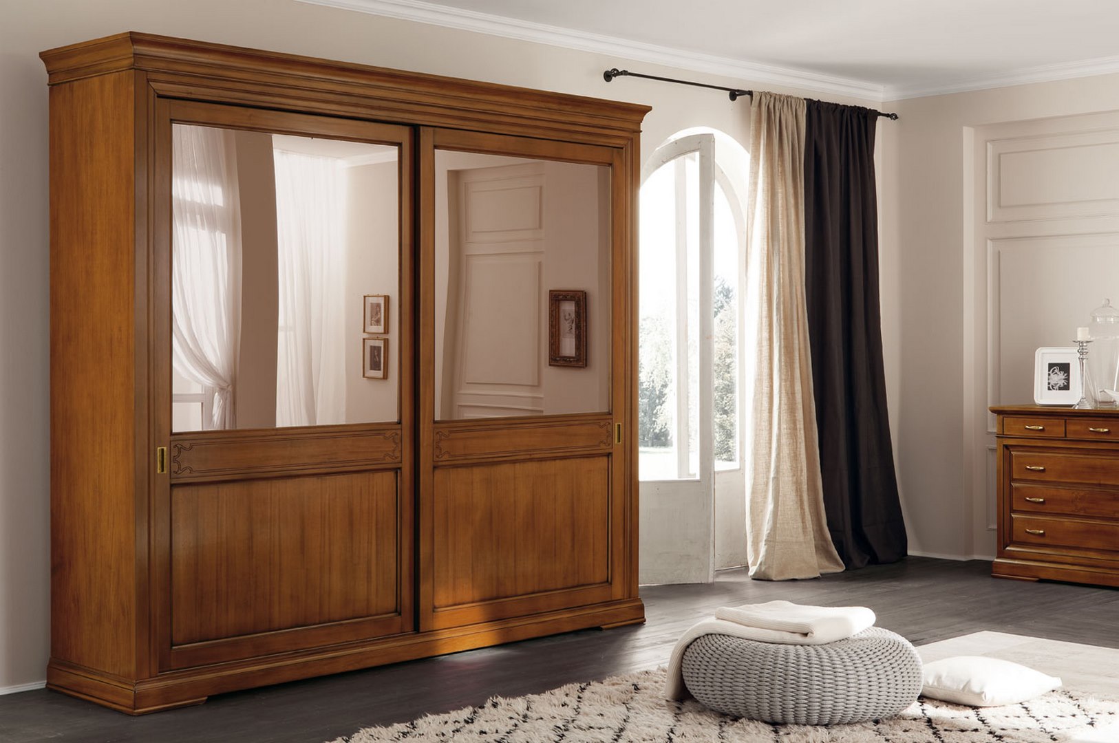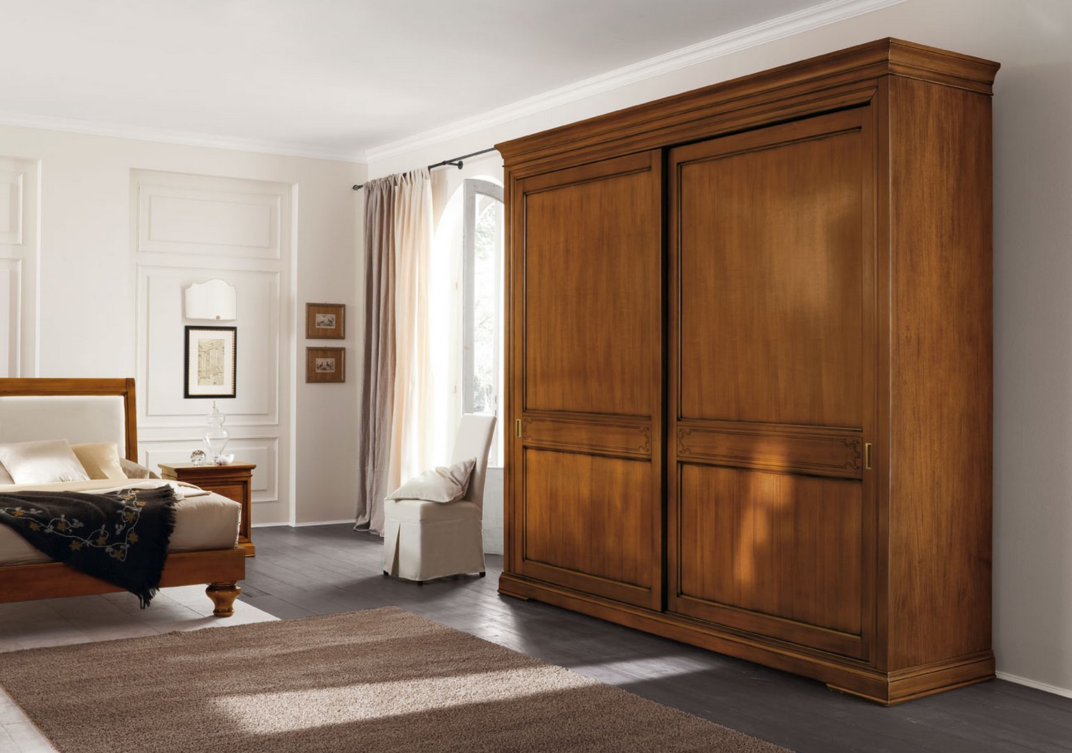 Wardrobe in limewood, with two sliding doors; fitted with interior set of drawers with top, shelf and three clothes rails.