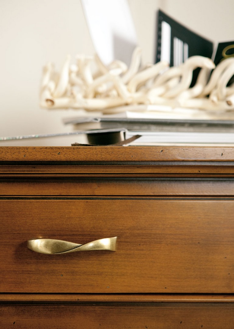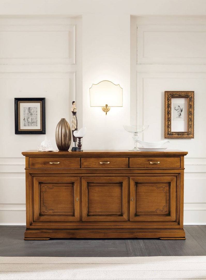 Sideboard in solid limewood, with wooden top, three exterior drawers and two hinged doors with lock; embellished with engraving on the doors and gilded handle.