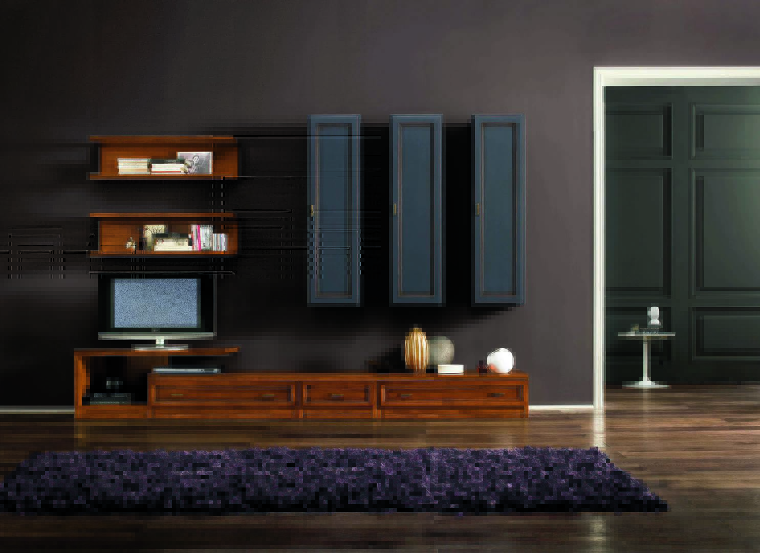 In the photo is presented a Modula composition made of three bases with one drawer each; one base a “C” and one shelf. It’s all in Essenza Noce finish.