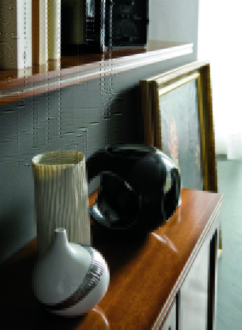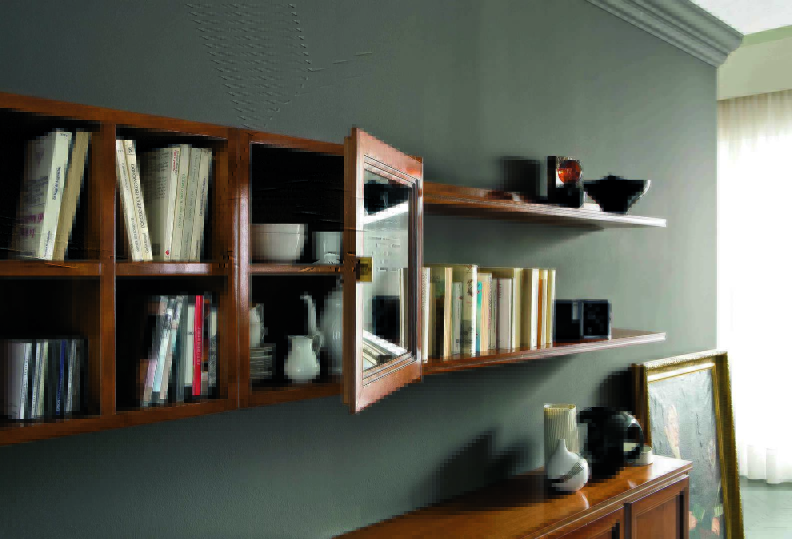 Composition Modula MD004, in Essenza Noce finish; it includes one bench on the ground, one tall unit with one door, one tall unit with two doors, two wall units with glass doors, one shelf and Crociera wall unit.