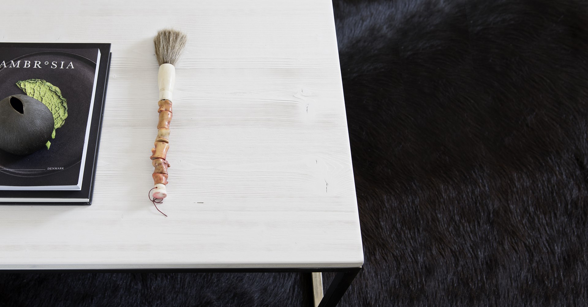 Iron coffee table made of top in brushed solid spruce with Bianco finish, and iron industry finish legs.