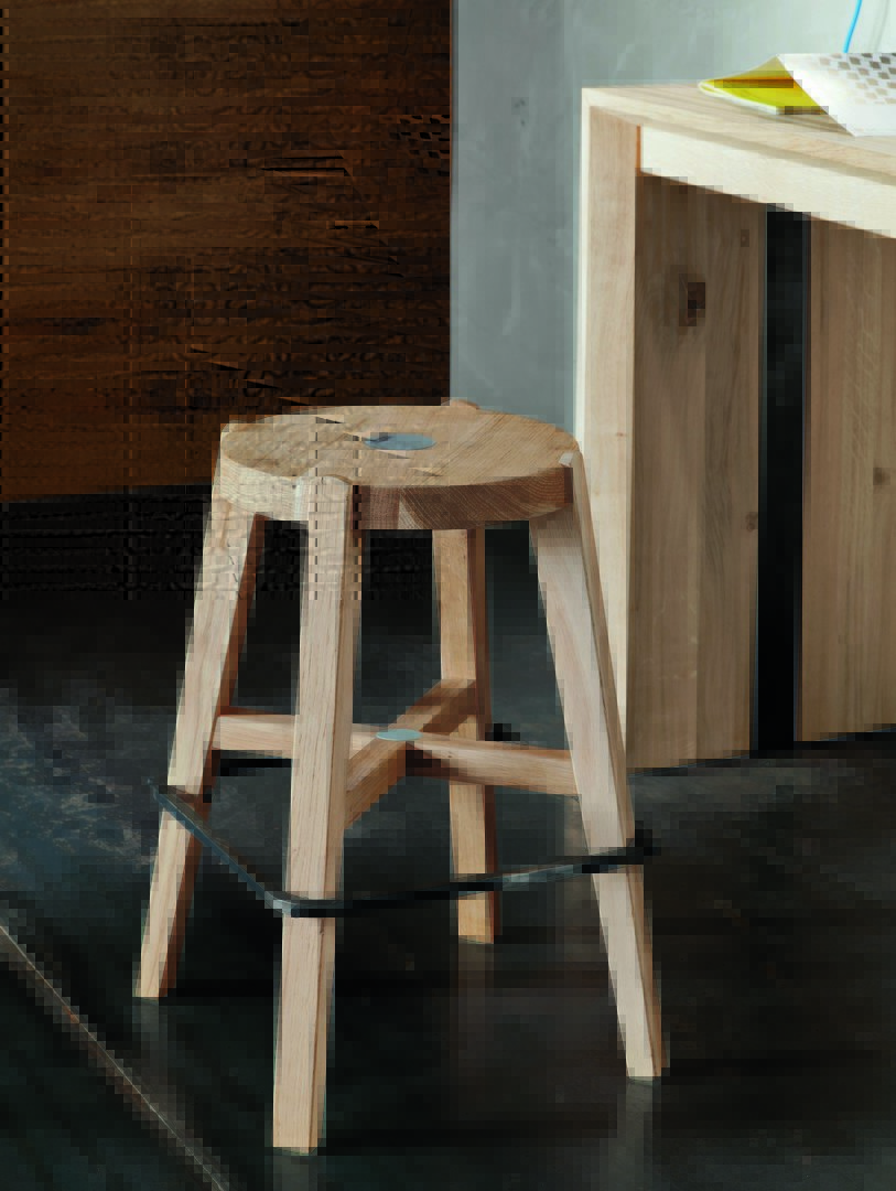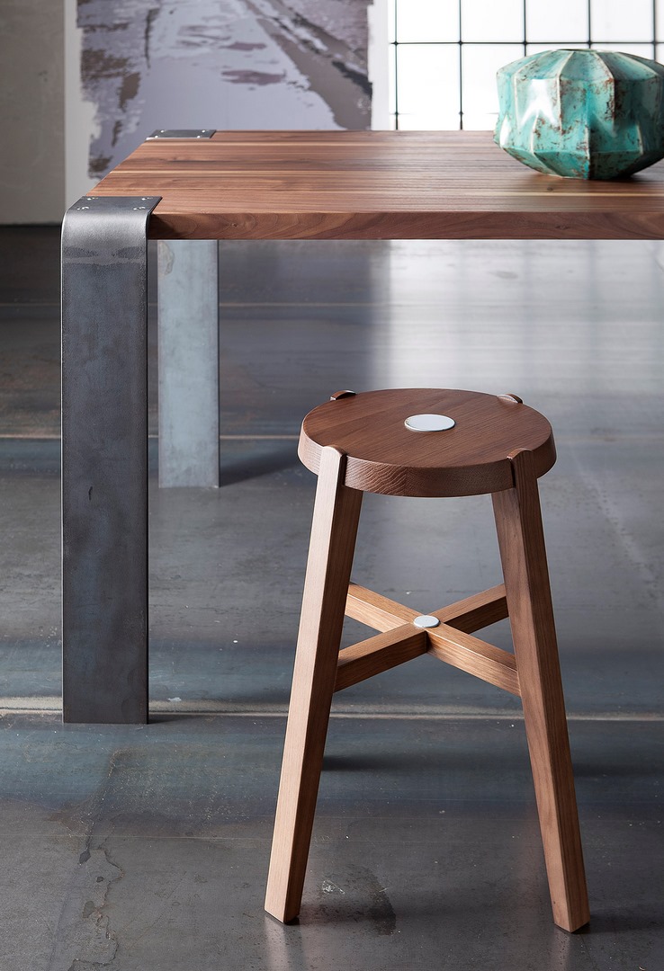 Small stool, in Alaska oak frame, is enriched in the central part of the seat with a Grigio Vintage insert. It is shown with or without industry iron footrest. It is proposed also in walnut structure and Bianco Vintage insert in the seat, without industry iron footrest.
