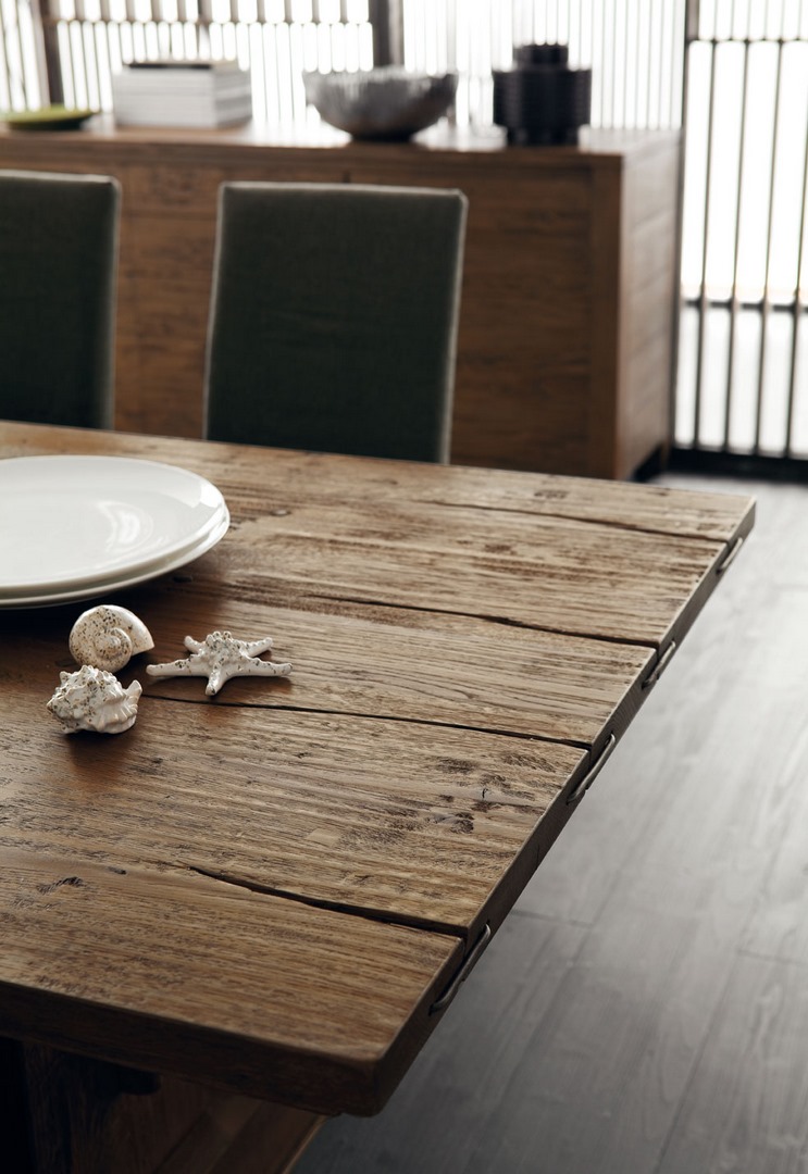 Oslo table with top made of boards split along the edges and joined at the ends using iron nails.
