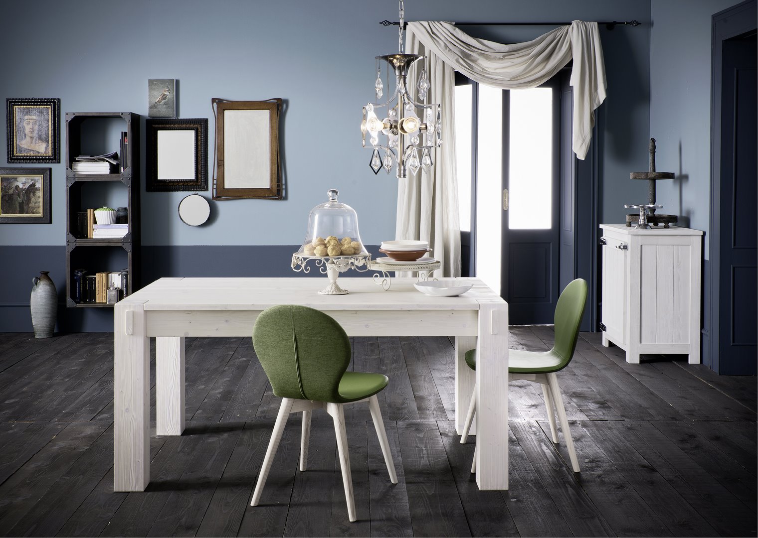 Stoccolma table in brushed sruce structure. Here presented in Bianco finish, with Nina chairs.