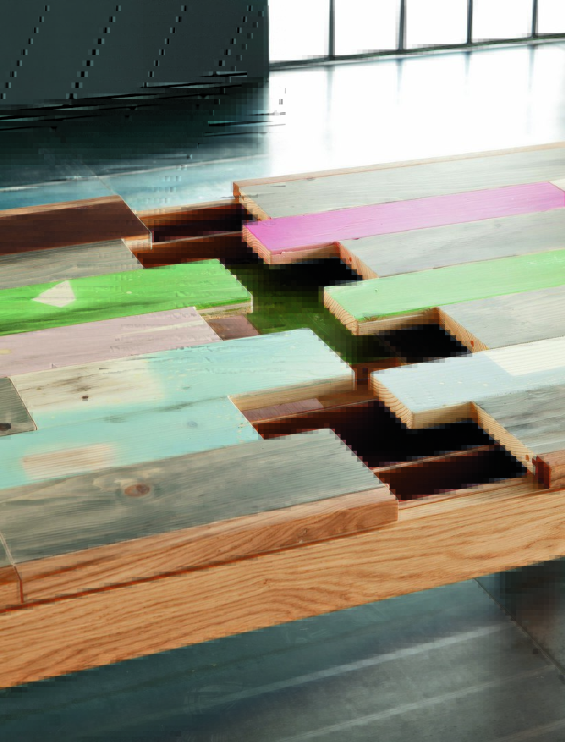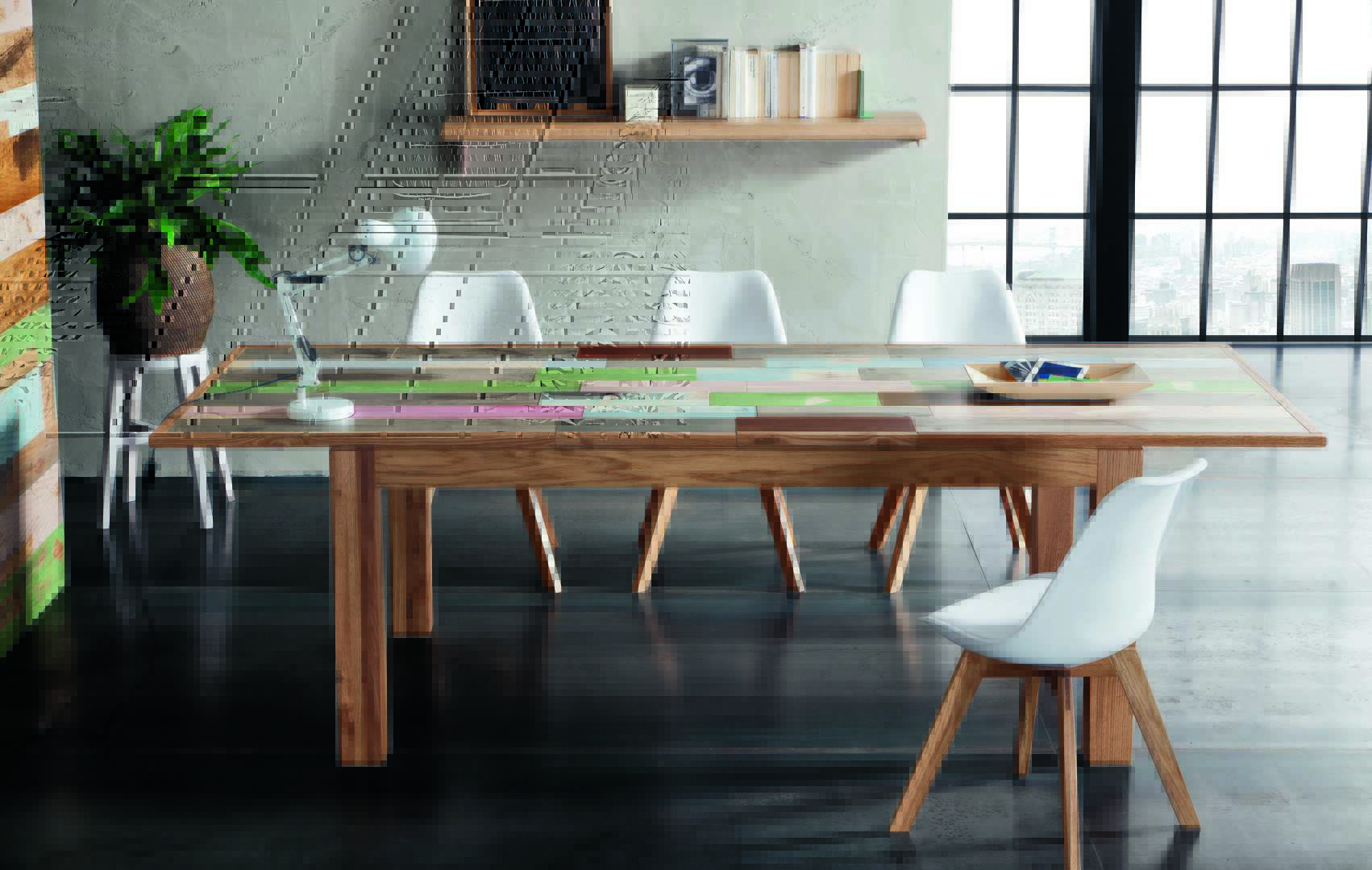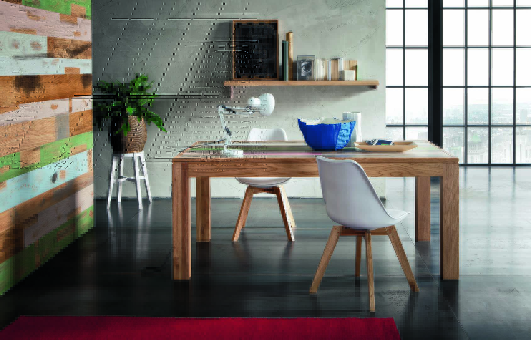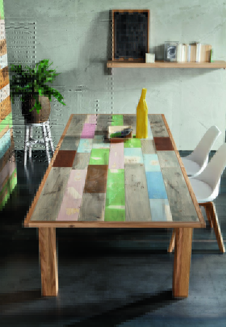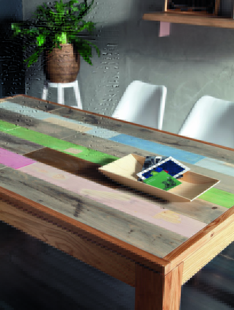 Varadero table with solid oak structure and legs. Top made from multi-coloured vintage spruce boards with a solid oak edge frame.