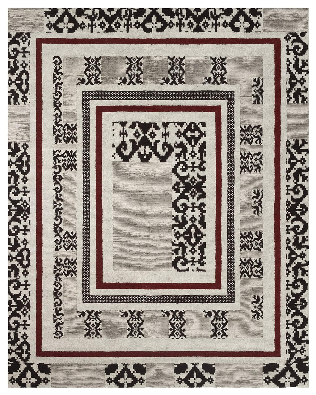 Nella collezione Contos de foghile (espressione sarda che significa “i racconti del focolare”) i colori sono quelli classici della tradizione e iconici della maison Marras: écru, nero e bordeaux. Anche i motivi sono una rivisitazione dei disegni tradizionali, attualizzati per trasportare la memoria nel presente. Nei tappeti Semestene e Barace sono inseriti all’interno di cornici concentriche, a sottolineare l’armonico contrasto fra decoro e rigore. La lavorazione, che si ispira alla tecnica di tessitura a grani pibiones tipica della cultura sarda, richiama i valori dell’artigianato più autentico.