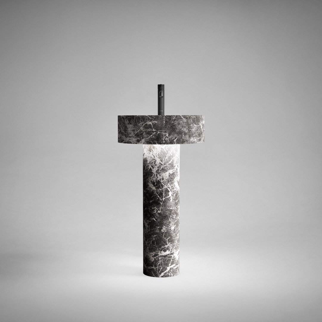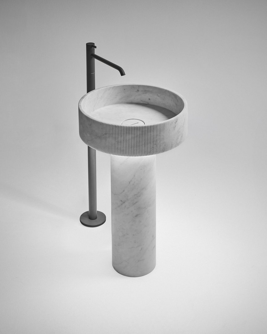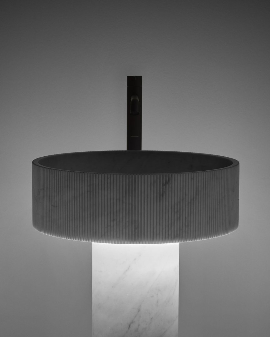 é una variante semplificata del lavabo Flow. Un’alternativa più focalizzata sulla funzionalità d’uso pur mantenendo inalterate le sue caratteristiche di purezza ed essenzialità formale. E’ composto da una combinazione equilibrata di due volumi cilindrici in marmo o pietra: la sottile colonna centrale con finitura levigata e la vaschetta caratterizzata da fitte scanalature verticali che rendono vibrante la sua superficie. Disponibile anche con illuminazione integrata.