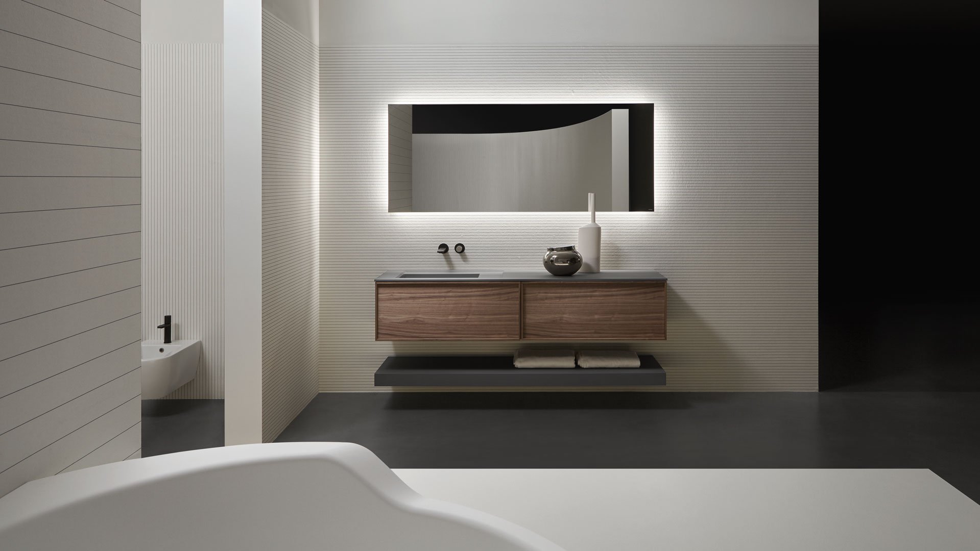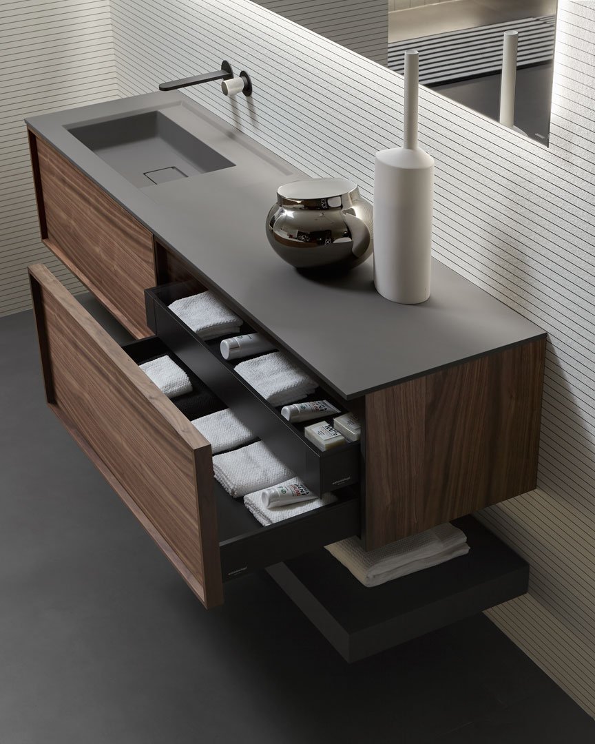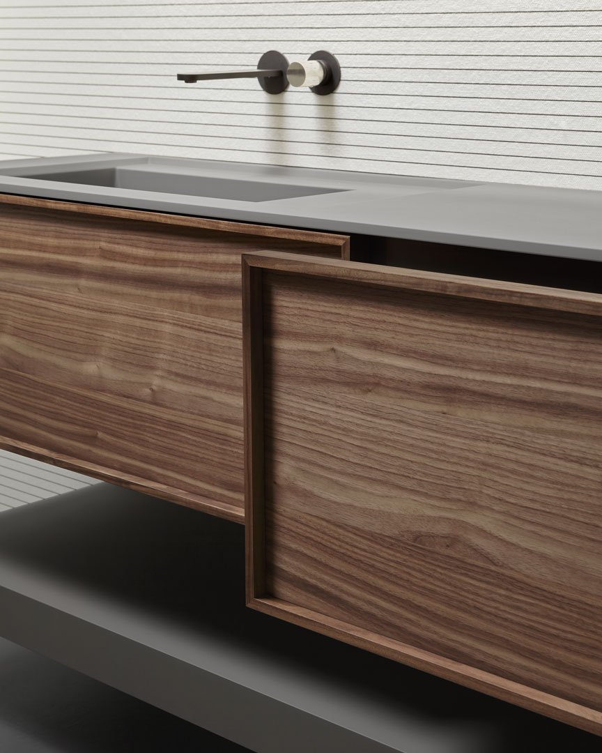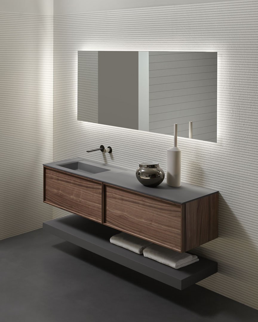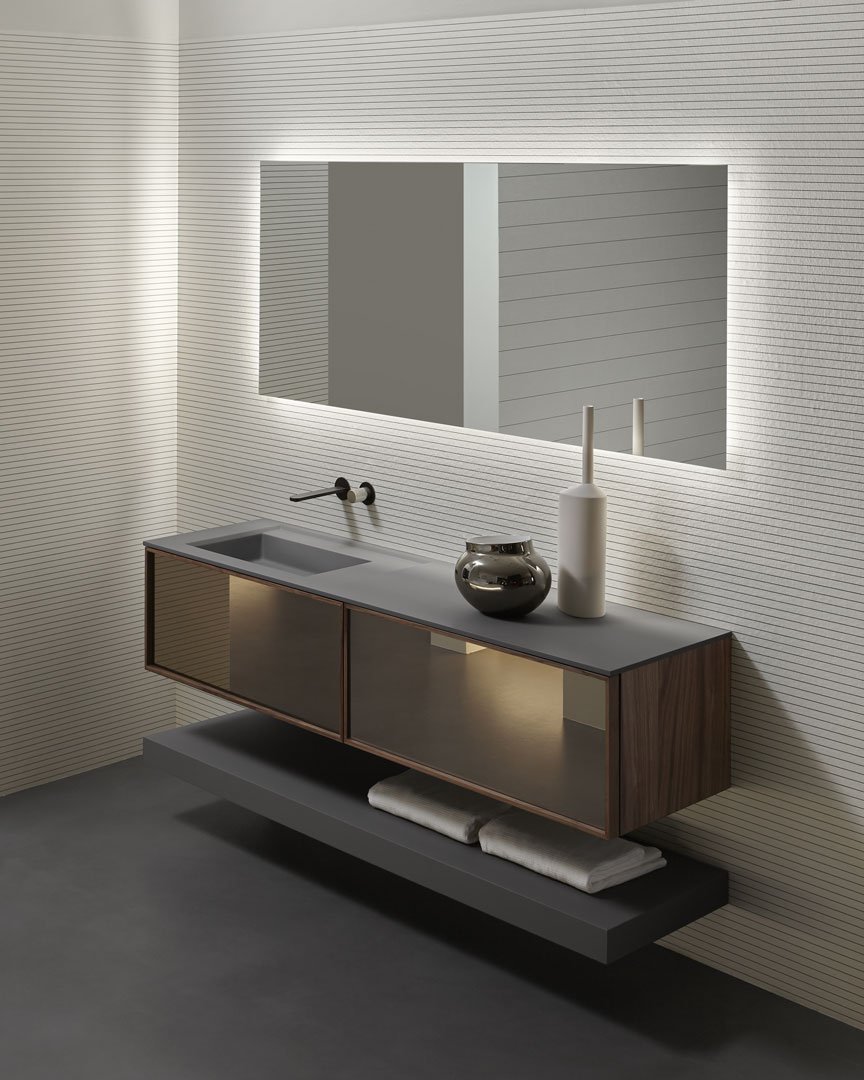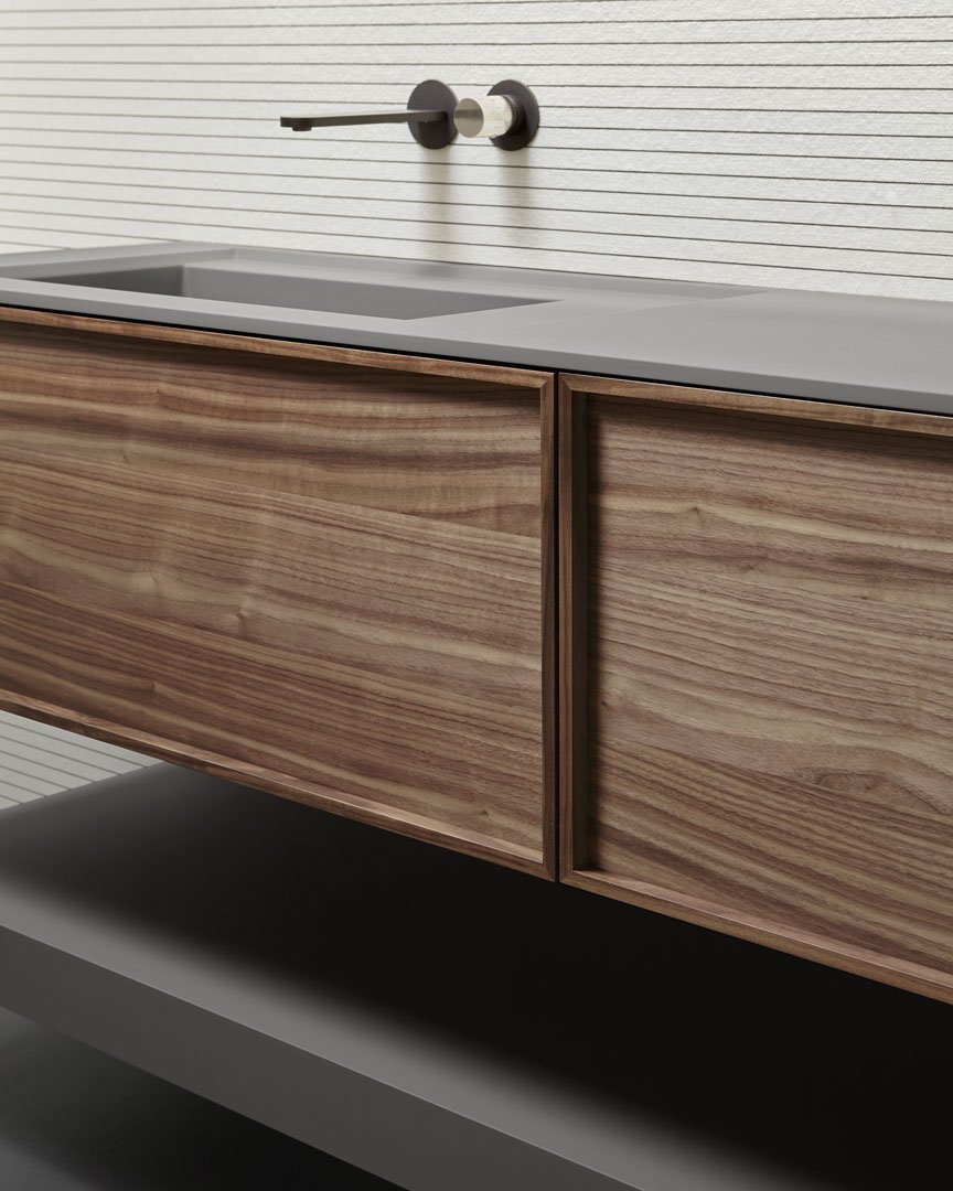 Una geometria pura, un volume nitido, regolare, perfetto nella sua essenzialità ma arricchito dal fascino della materia, una collezione contemporanea ma capace di inserirsi in contesti di stile diversi grazie ai materiali, colori e finiture disponibili, un elemento che esprime leggerezza ed eleganza, un equilibrio dimensionale che fa degli spessori sottili il proprio tratto distintivo. Il tratto distintivo di Riquadro è appunto la cornice evidente, il telaio dell’anta esplicitato in rilievo, un frame prezioso che definisce lo spazio, lo delimita, completandolo.