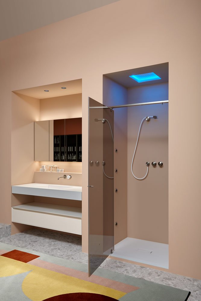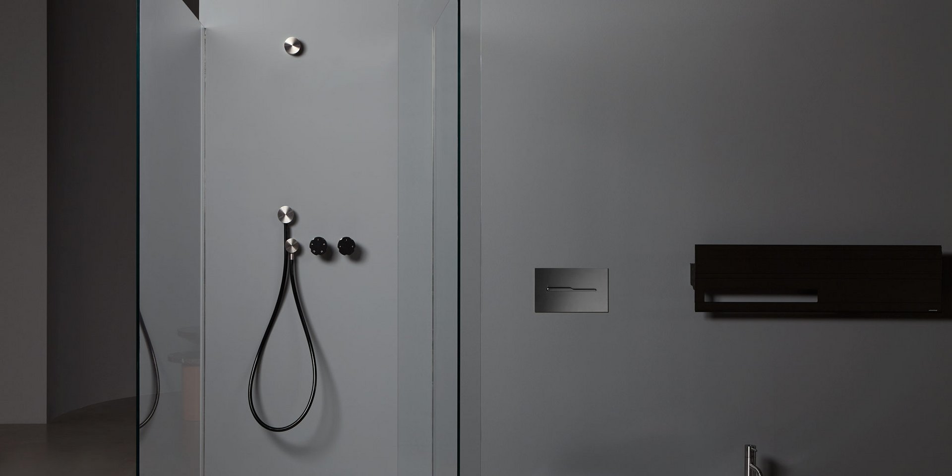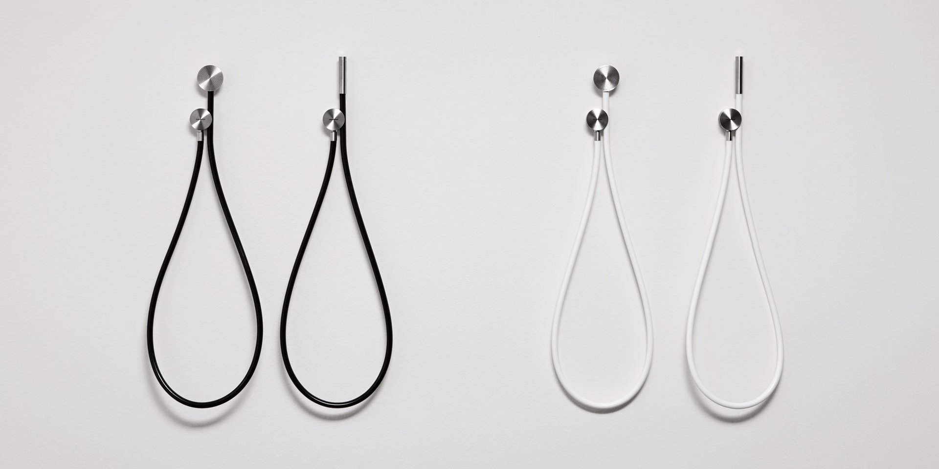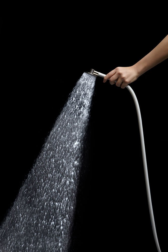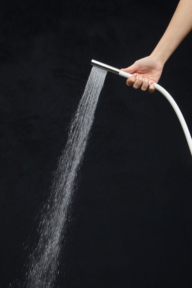 Hand shower in satin or polished stainless steel or graphite finish complete with wall support and water outlet, flexible hose 150 cm in silicone colored white, black or grey.