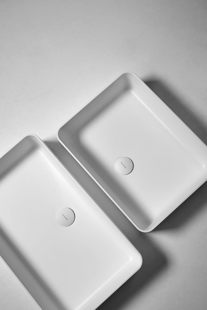 Round top mount Flumood, can be externally lacquered in all colors of our collection or Ceramilux sink complete with drain pipe fitting and open plug.