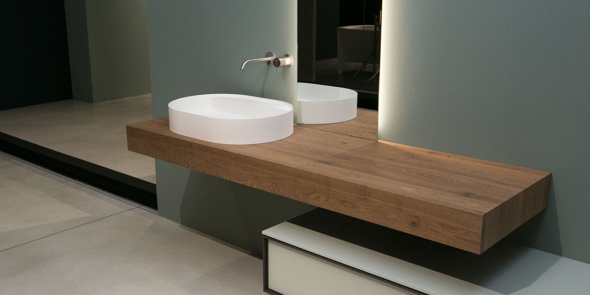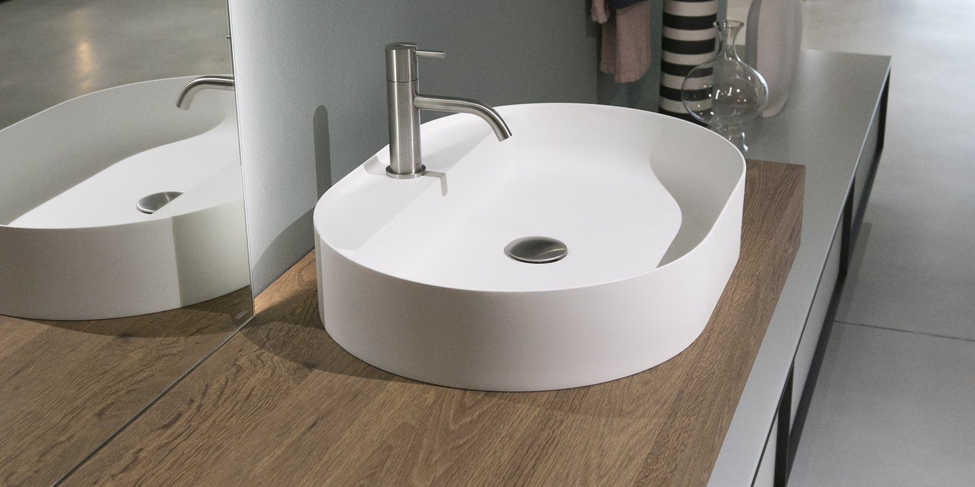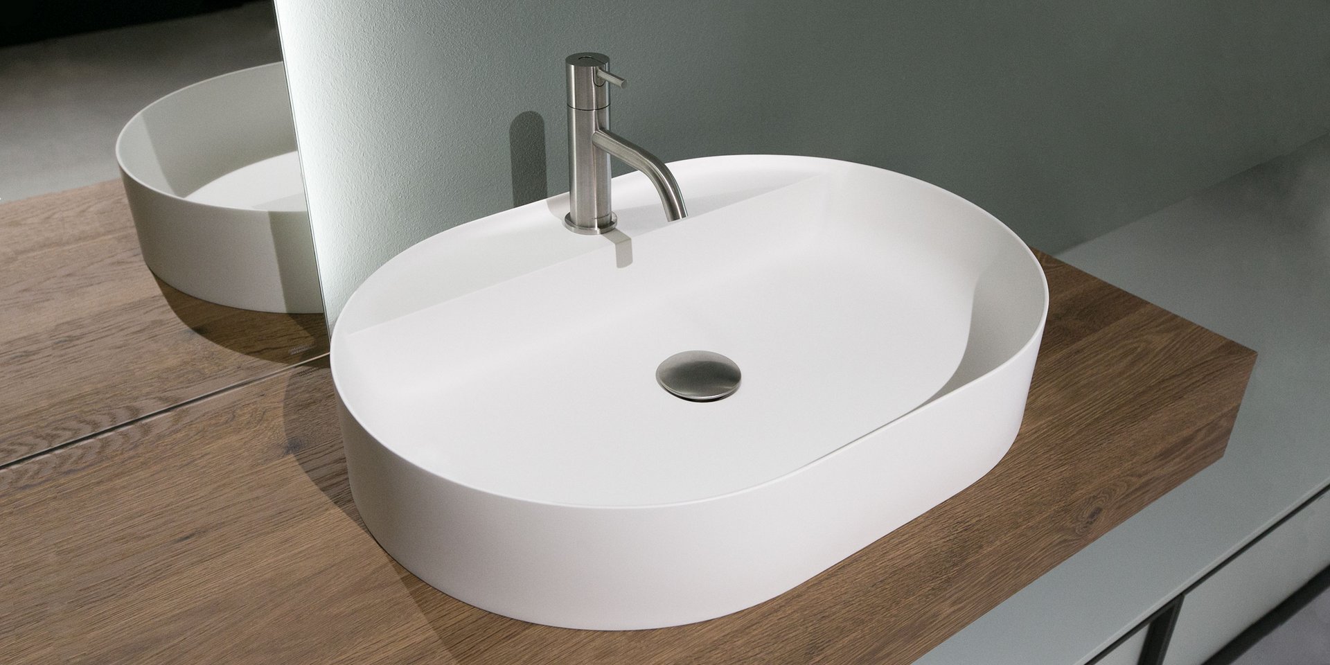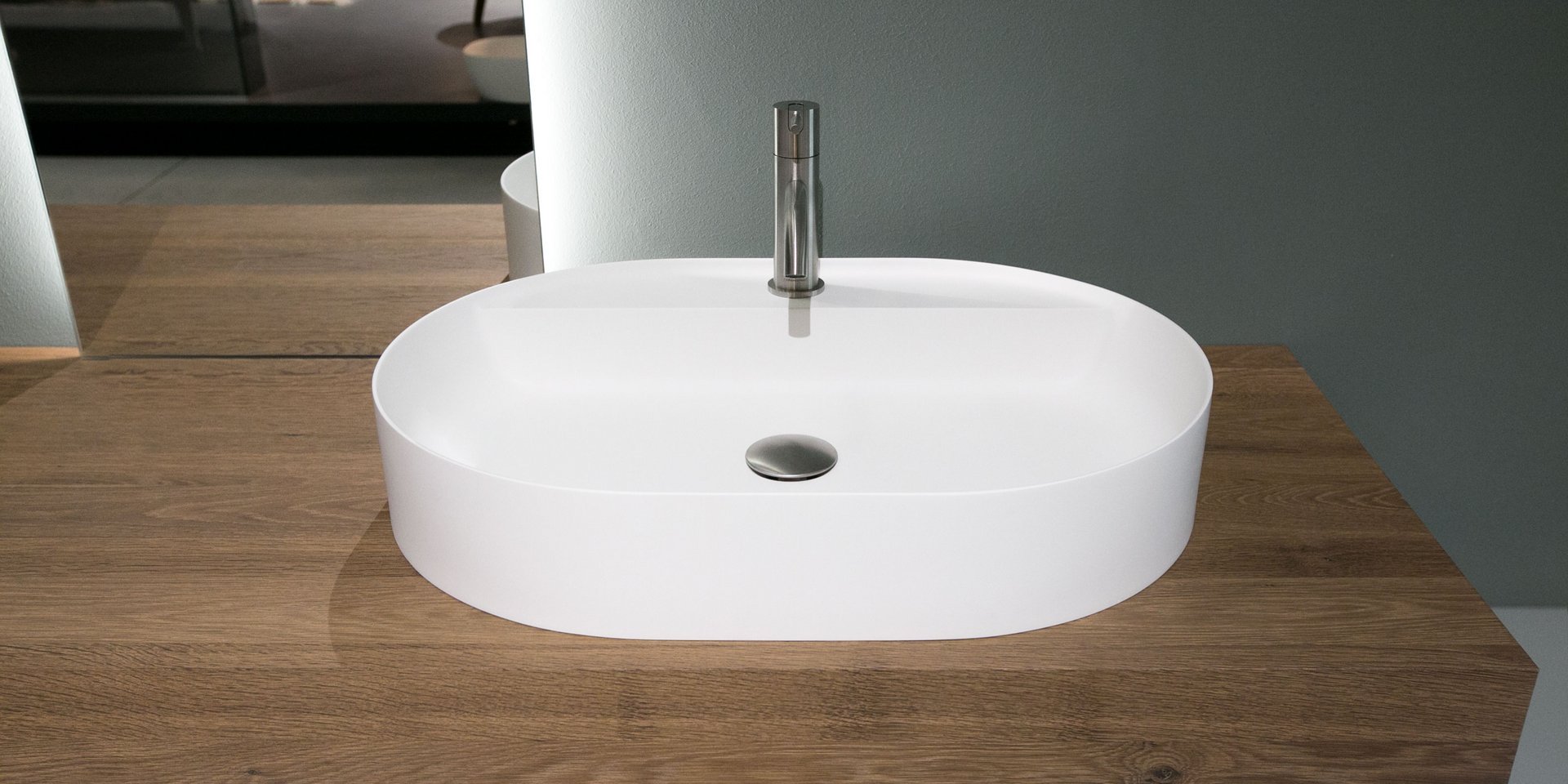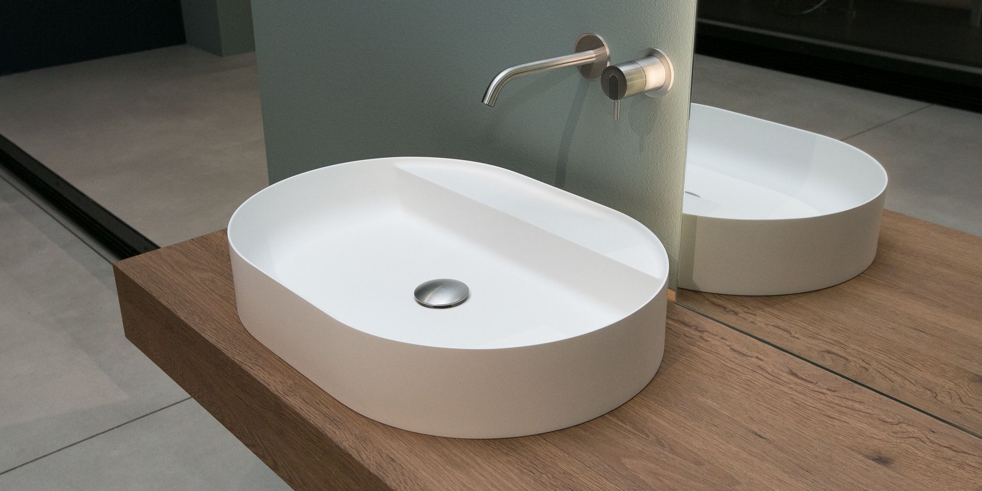 Oval top mount Flumood? sink, complete with drain pipe fitting and open plug. Can be lacquered externally.