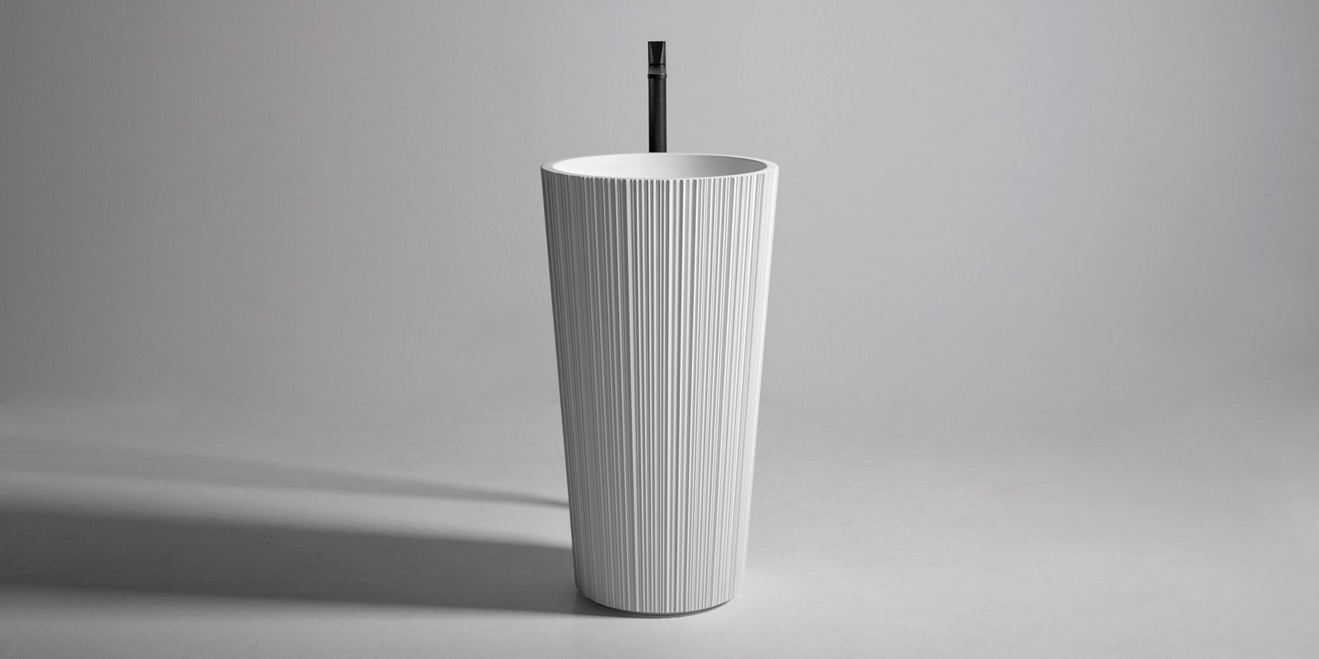Freestanding flumood sink with floor drainage complete with open plug, siphon and flexible hose.