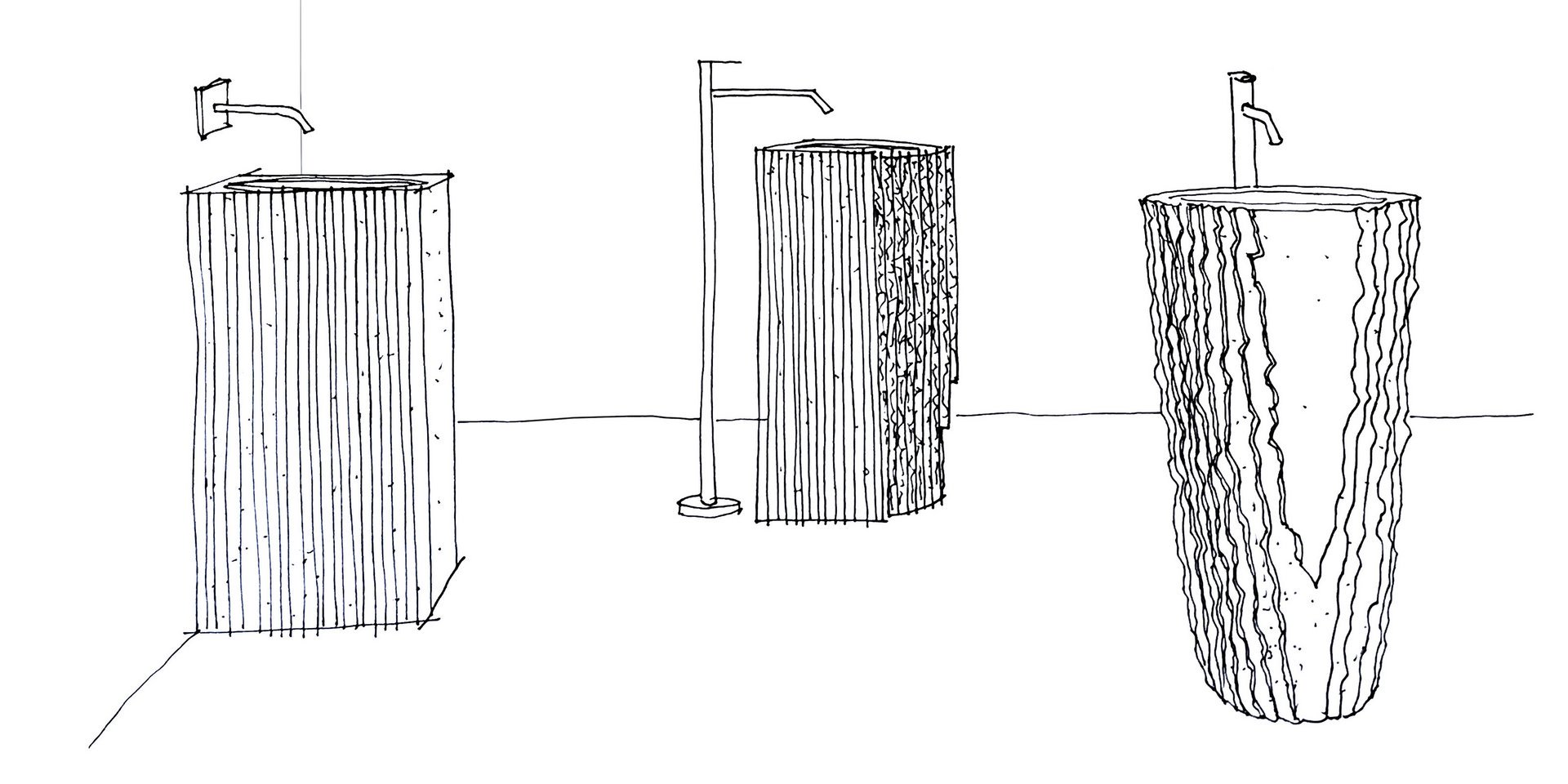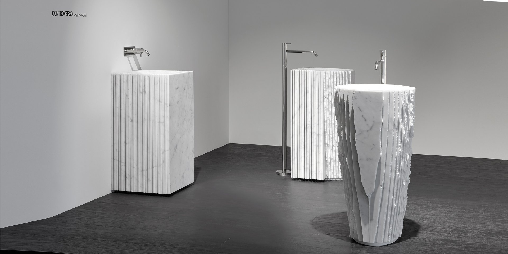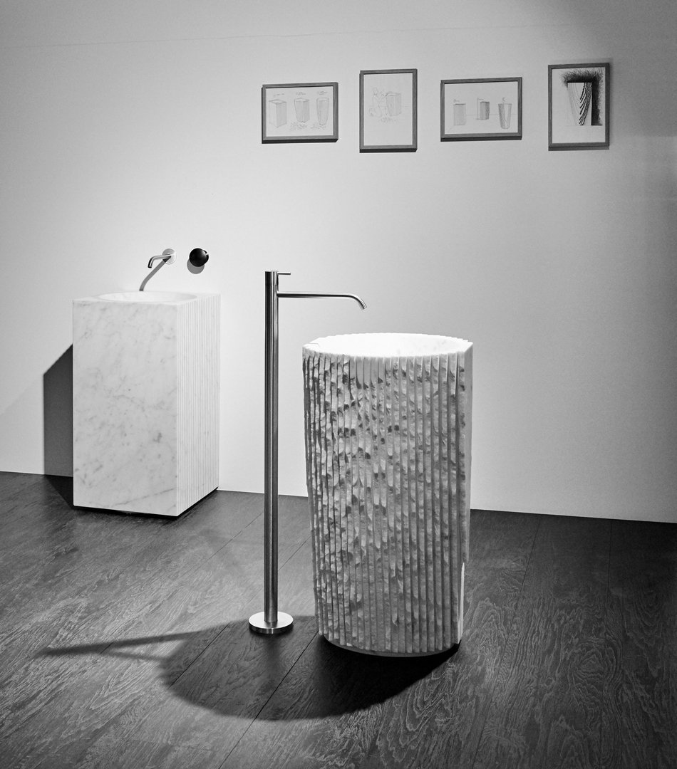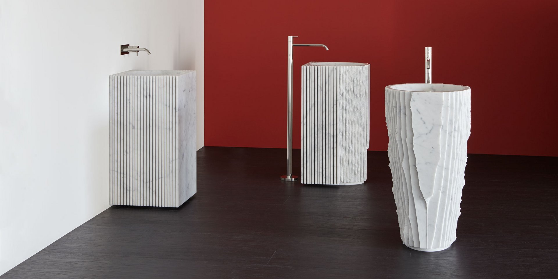 Freestanding stone sink, complete with drain pipe fitting and open plug, trap and flexible hose.