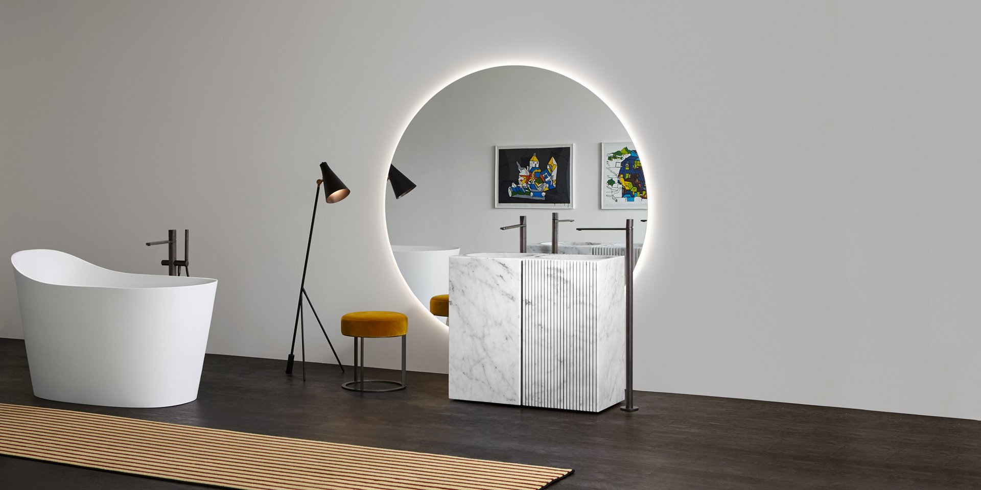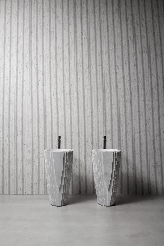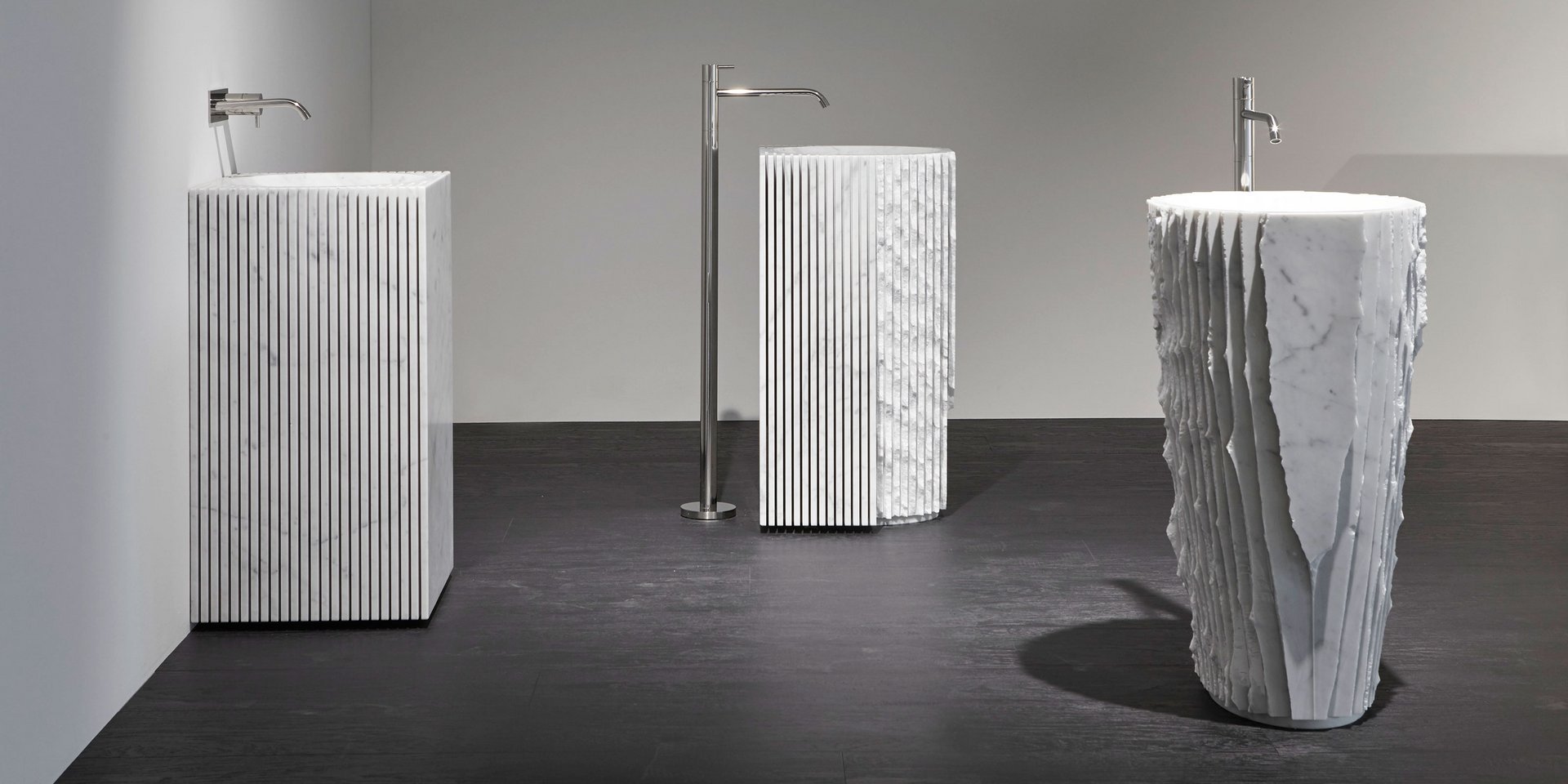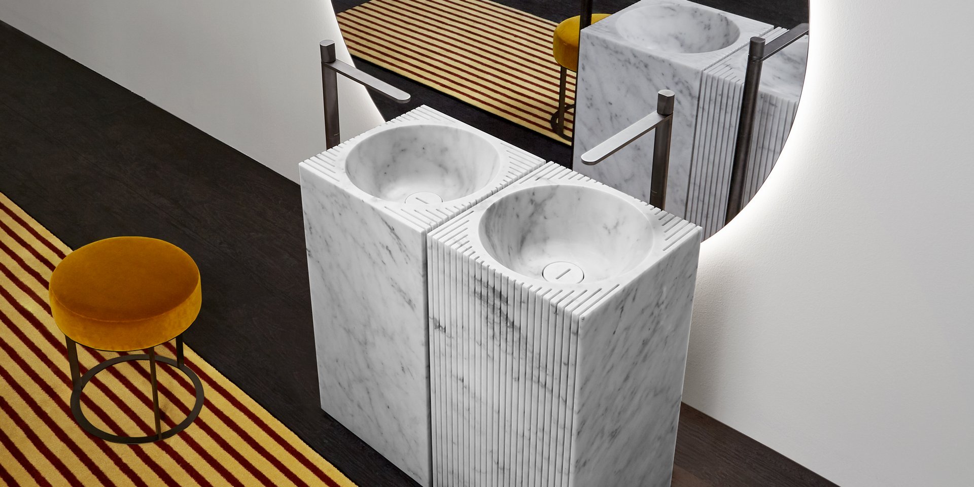 Freestanding stone sink, complete with drain pipe fitting and open plug, trap and flexible hose.